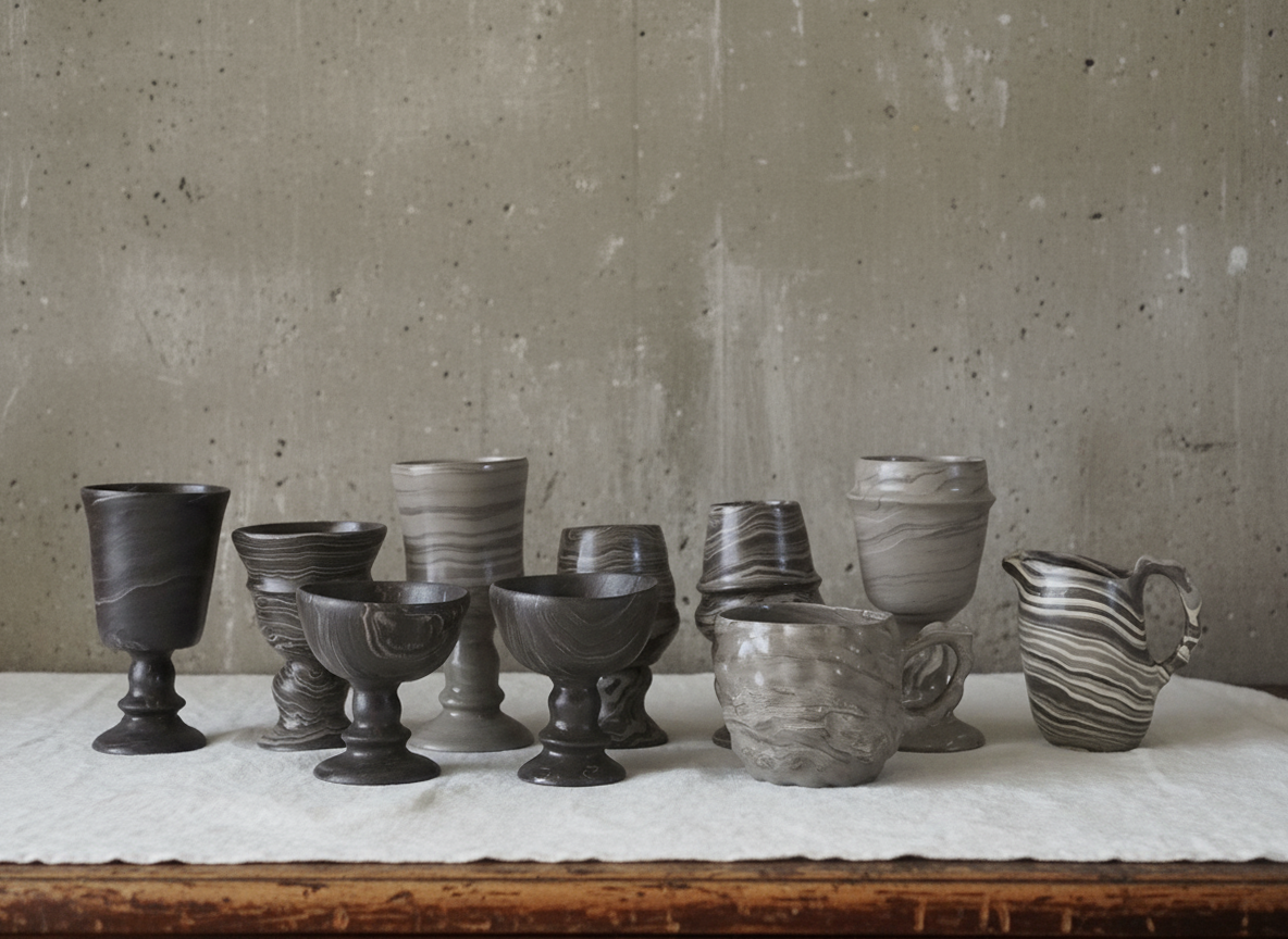 カラフルな土を使ったマーブルを得意とする藤川氏だが、新月のために黒を基調としたシリーズを制作。