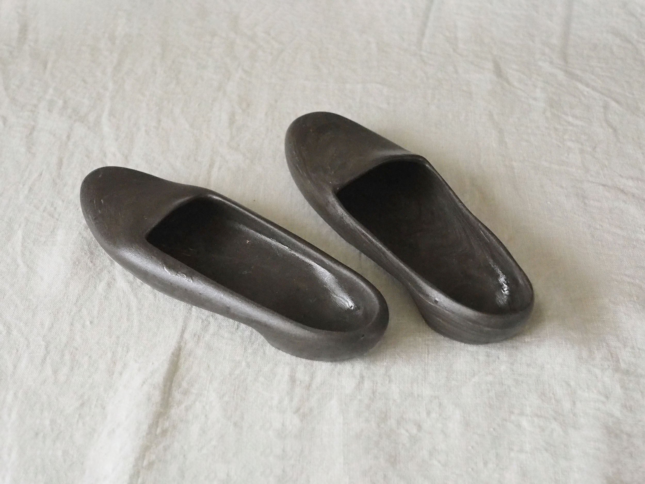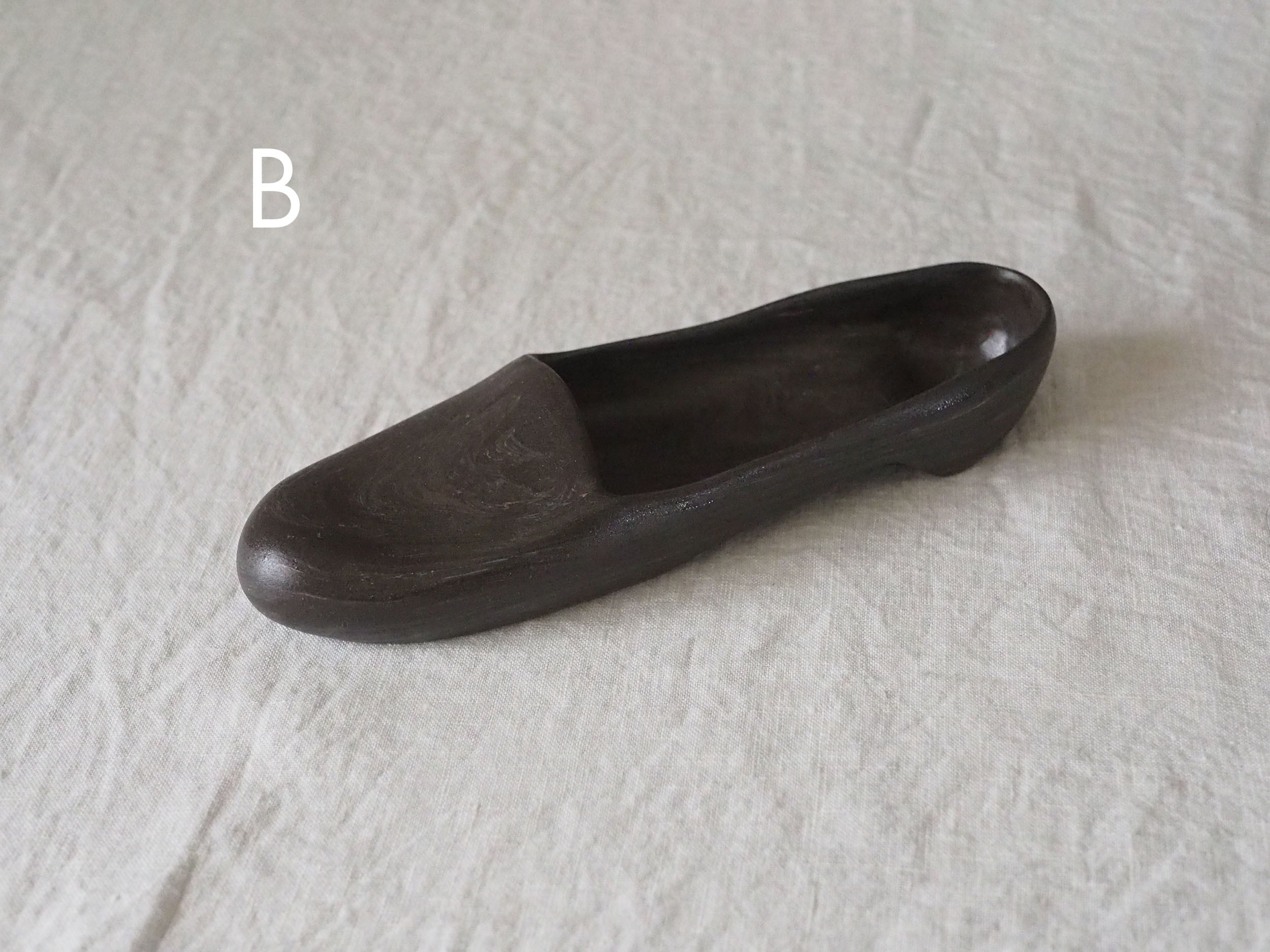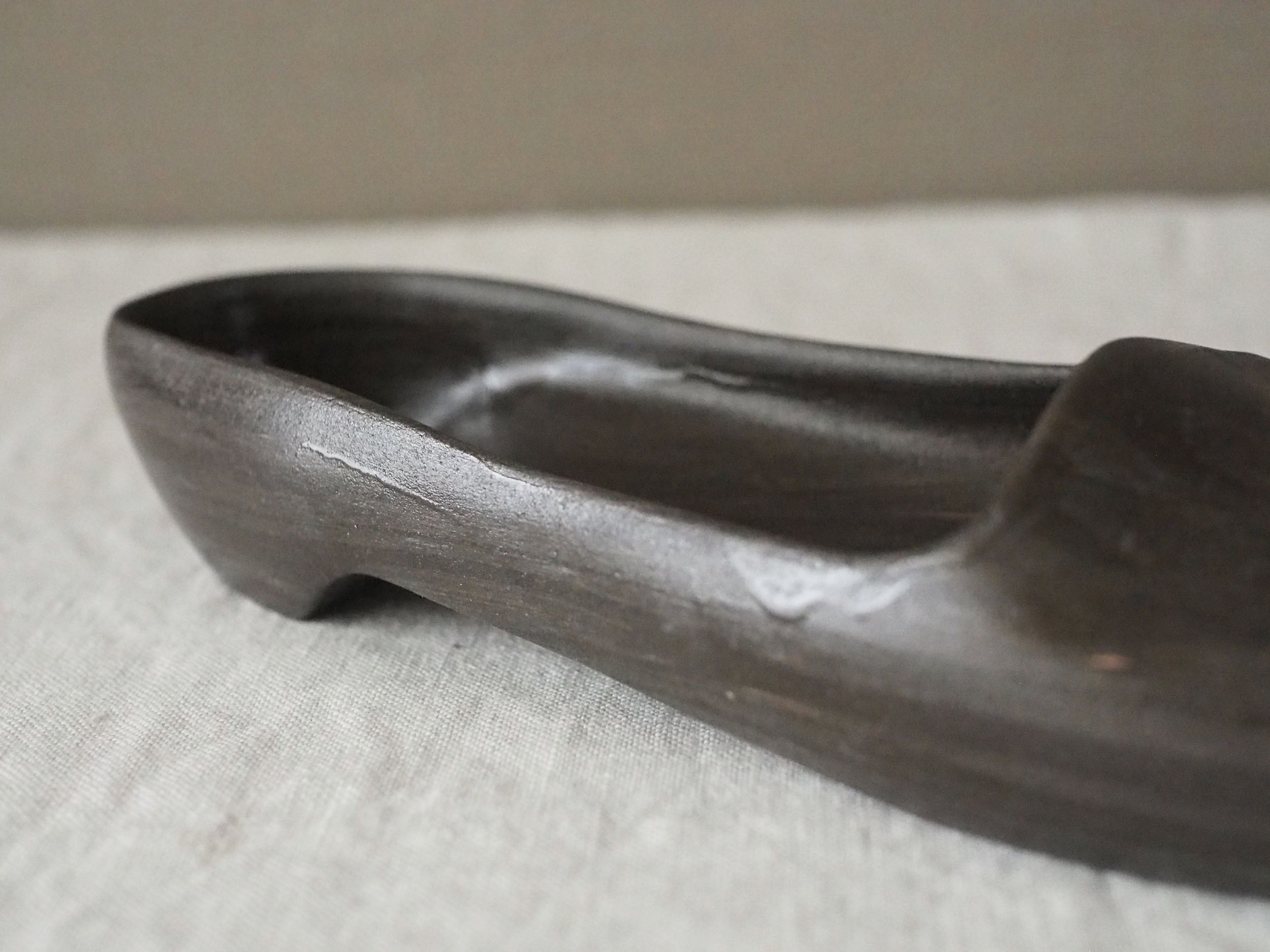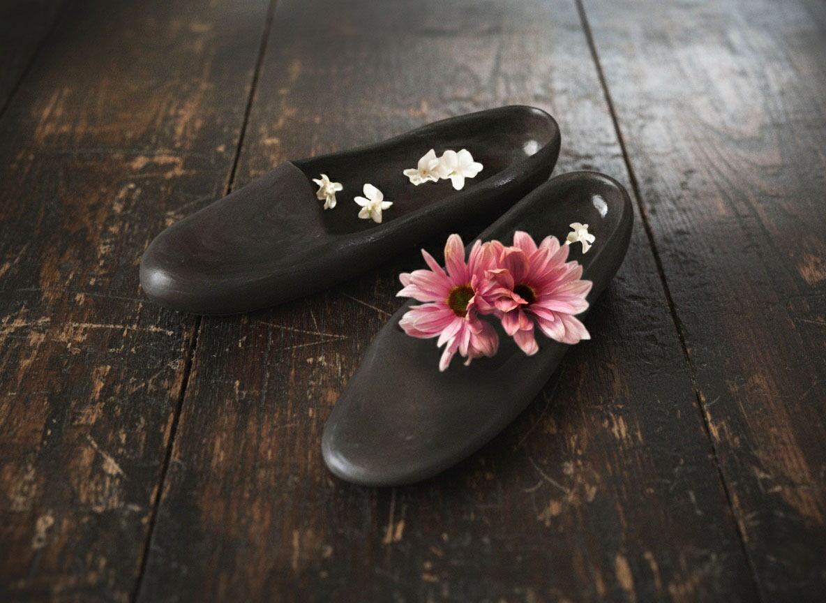 表面にマーブルが施されているのではなく、マーブルに練り込んだ土の塊からカタチを削り出していくというまるで彫刻のような技法です。それは木彫か大理石を削ったかのような表情をみせてくれます。靴の中も削り出しをしています。