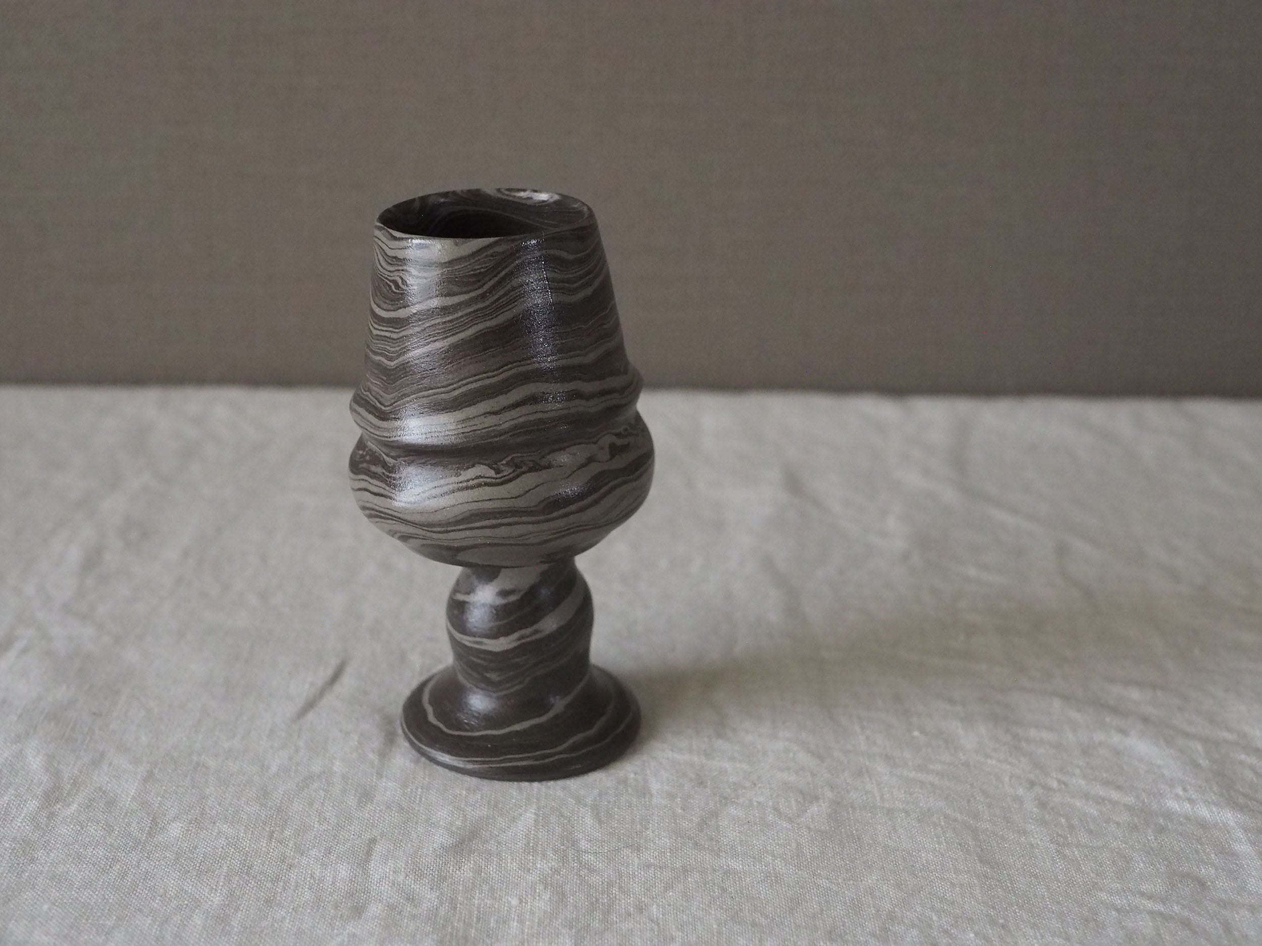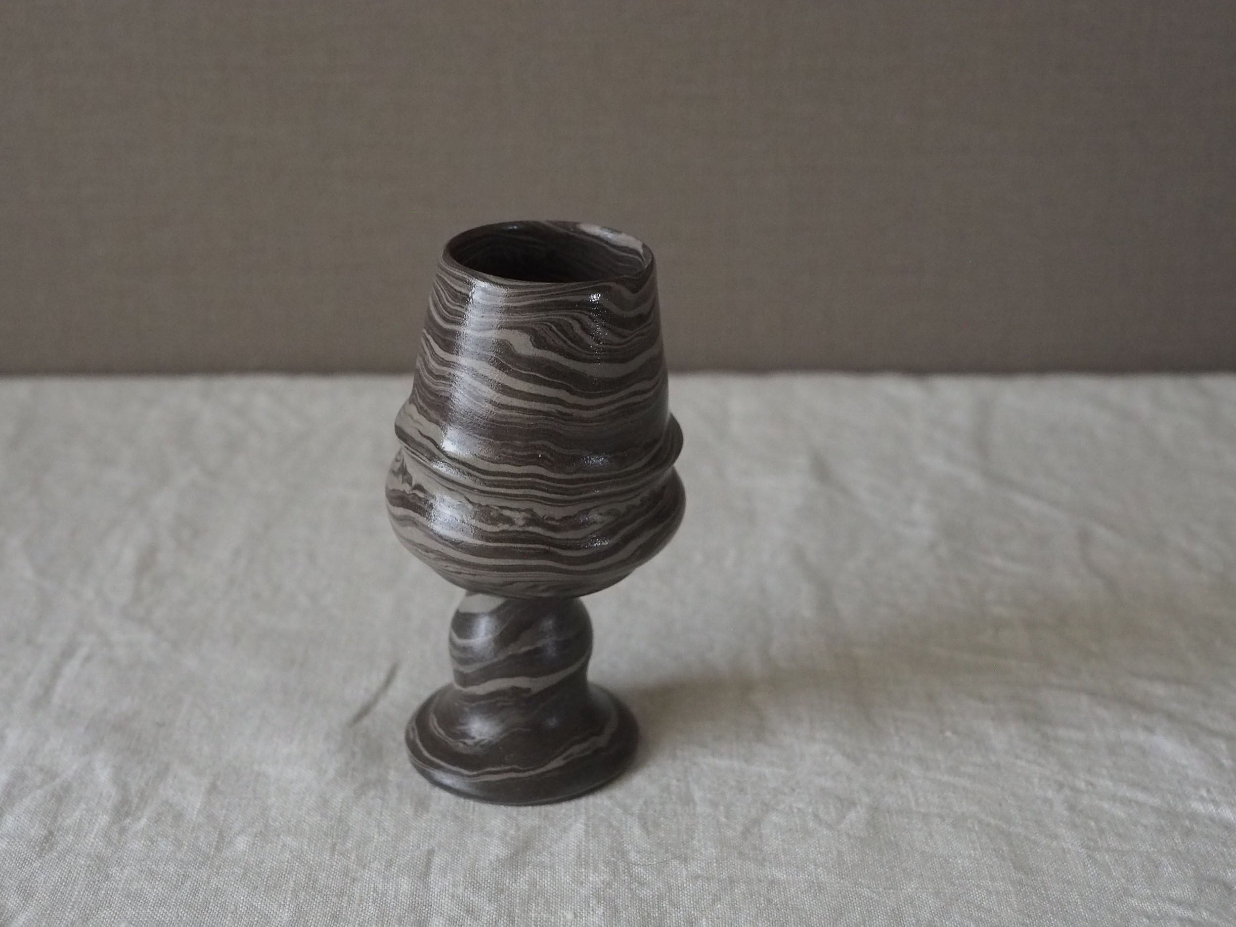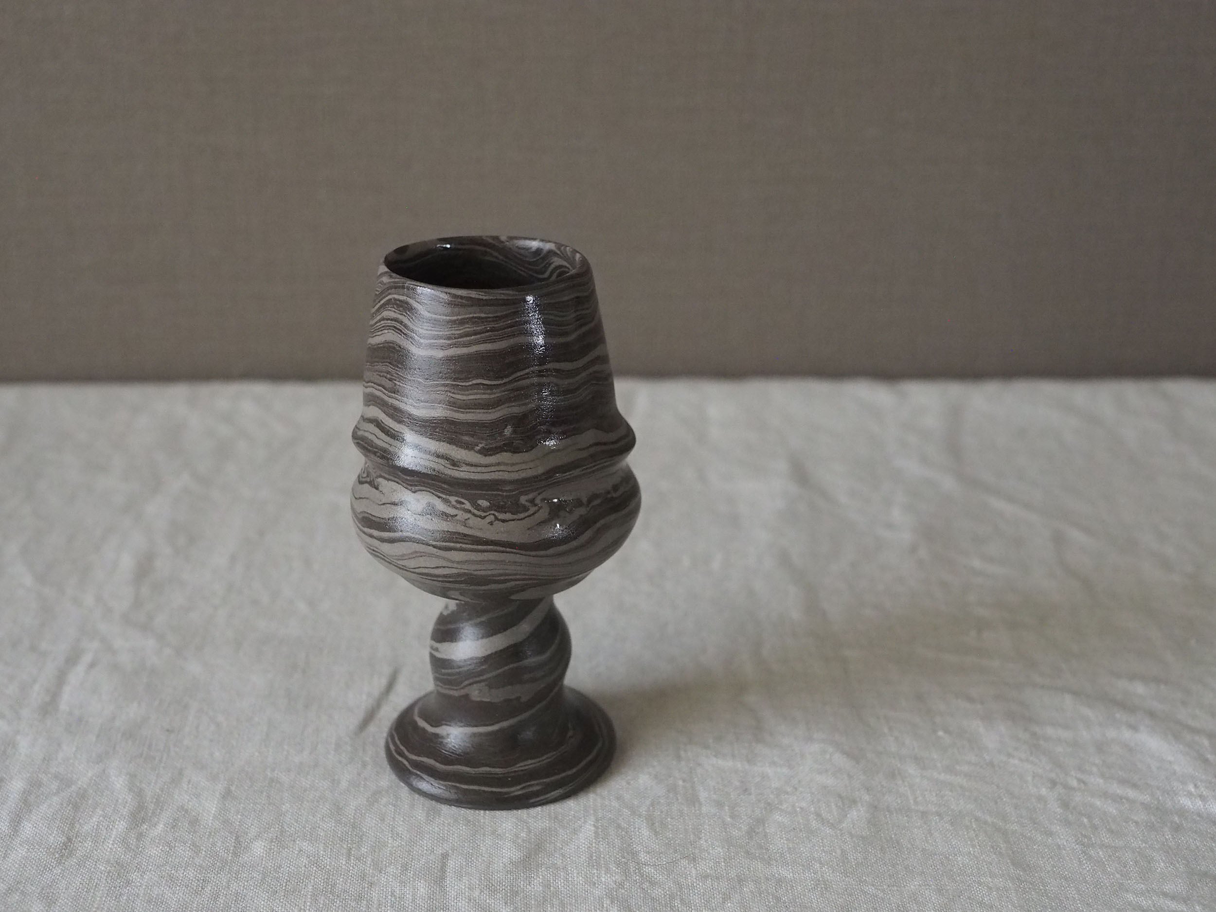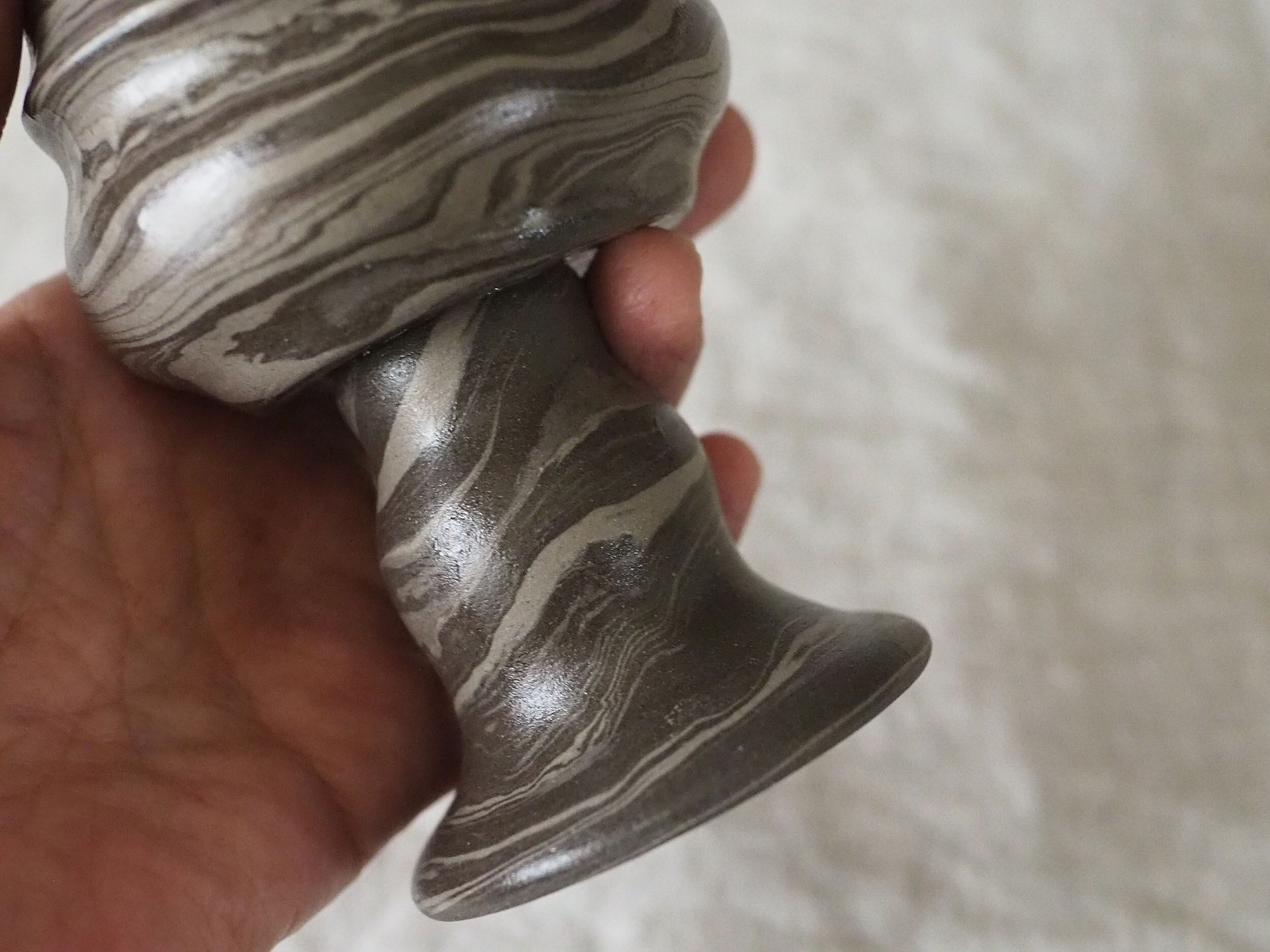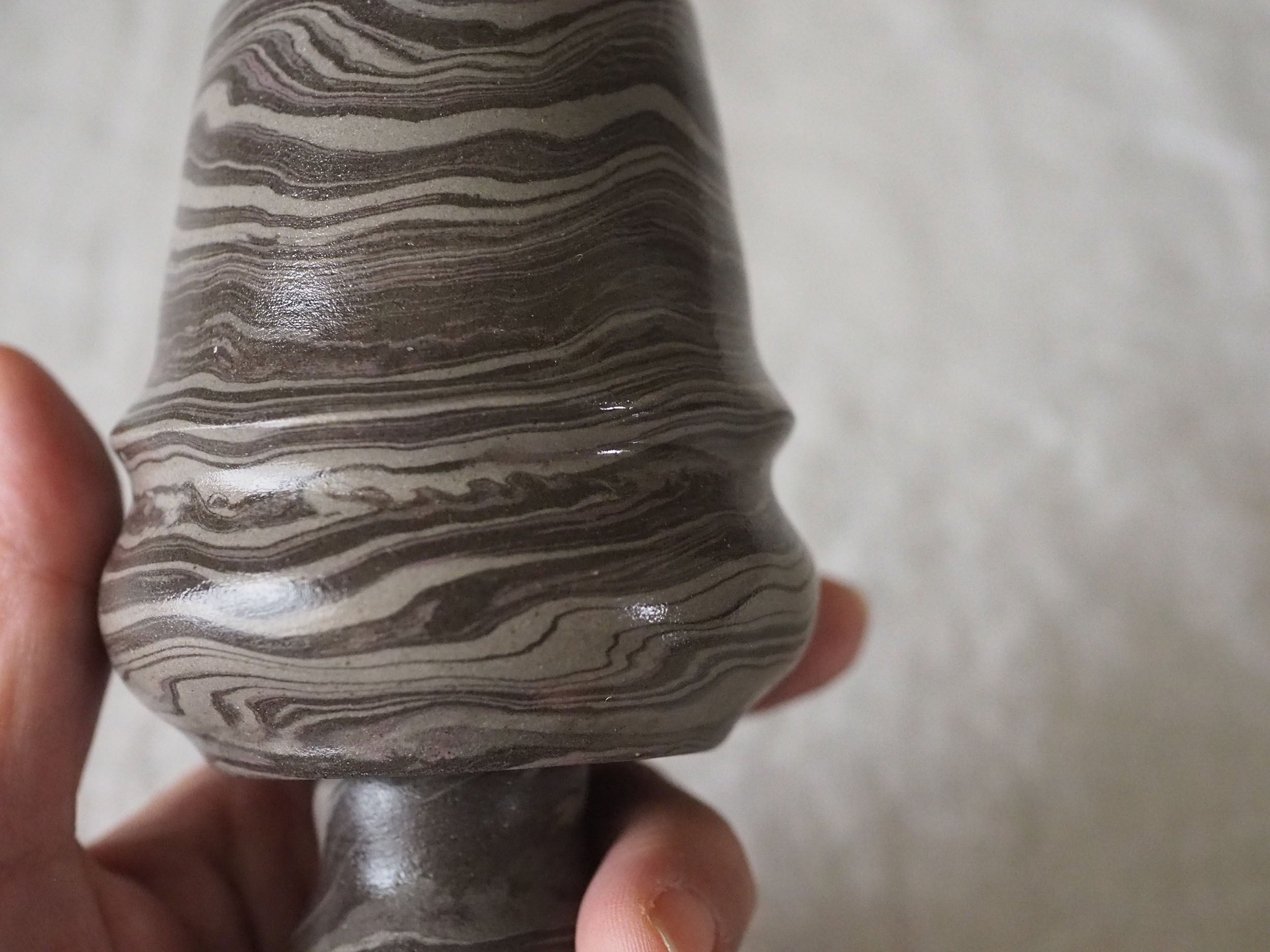 表面にマーブルが施されているのではなく、マーブルに練り込んだ土の塊からカタチを削り出していくというまるで彫刻のような技法です。それは木彫か大理石を削ったかのような表情をみせてくれます。少しイビツな揺らぎが有機的で藤川氏らしい作品です。