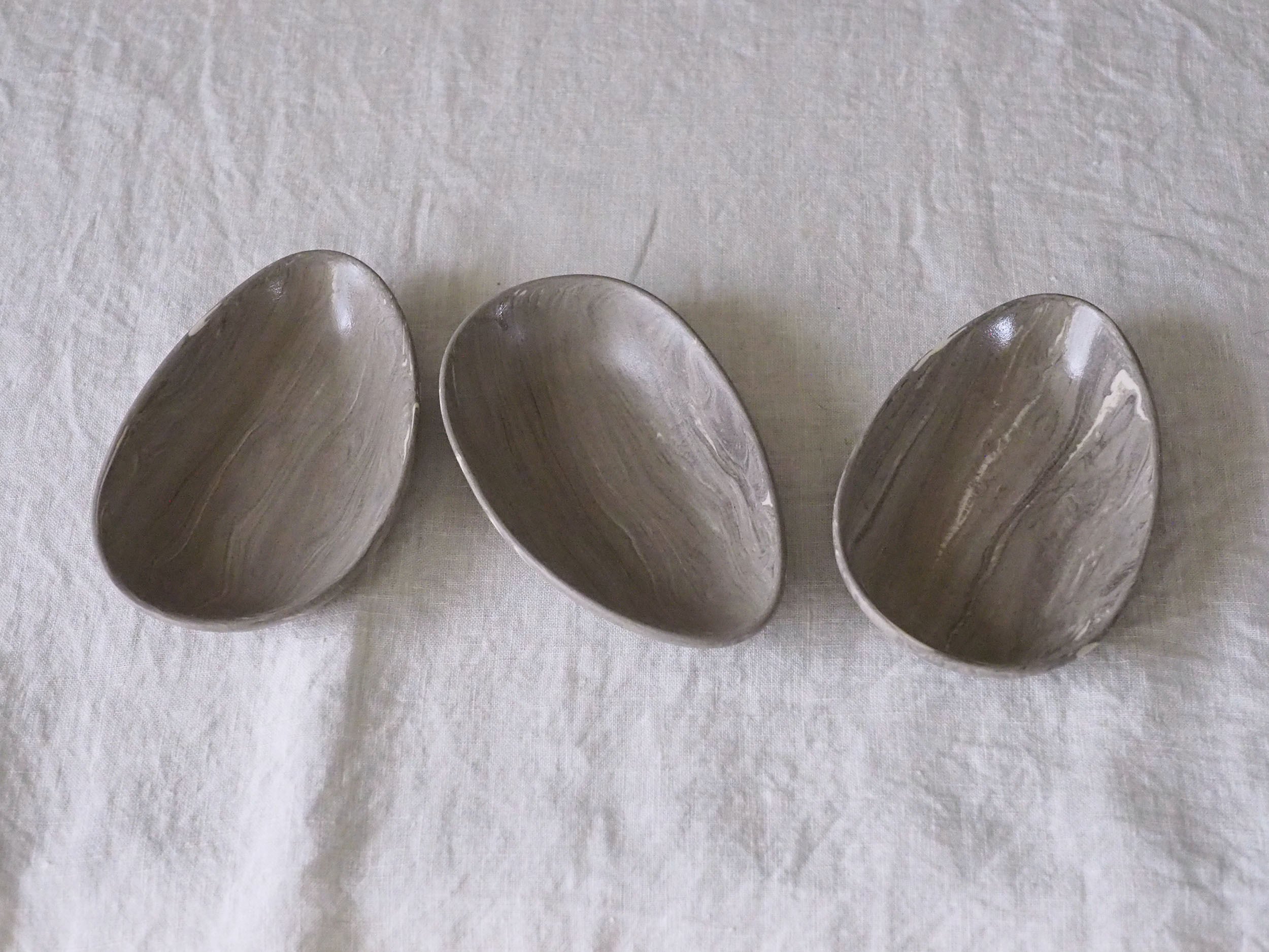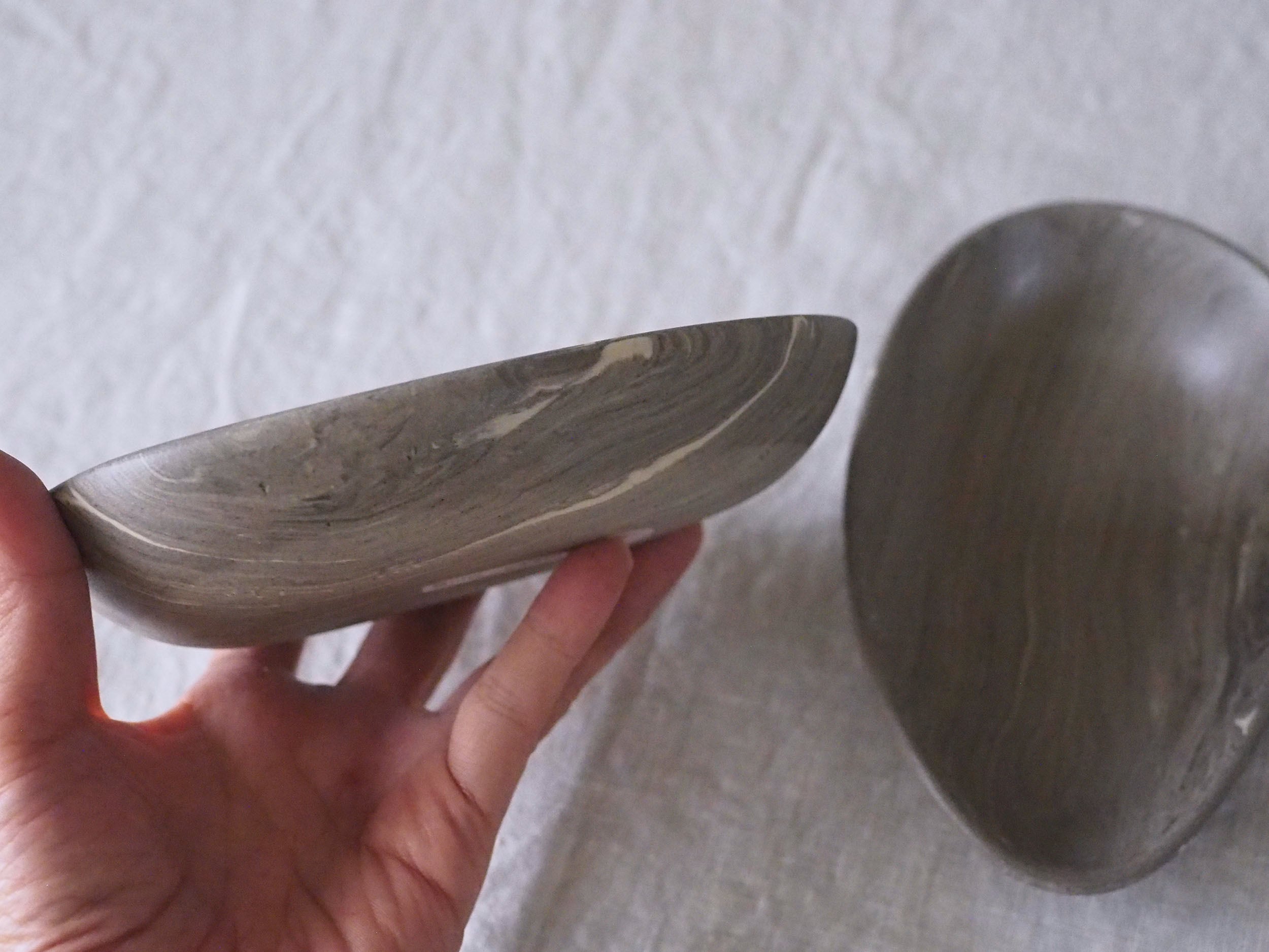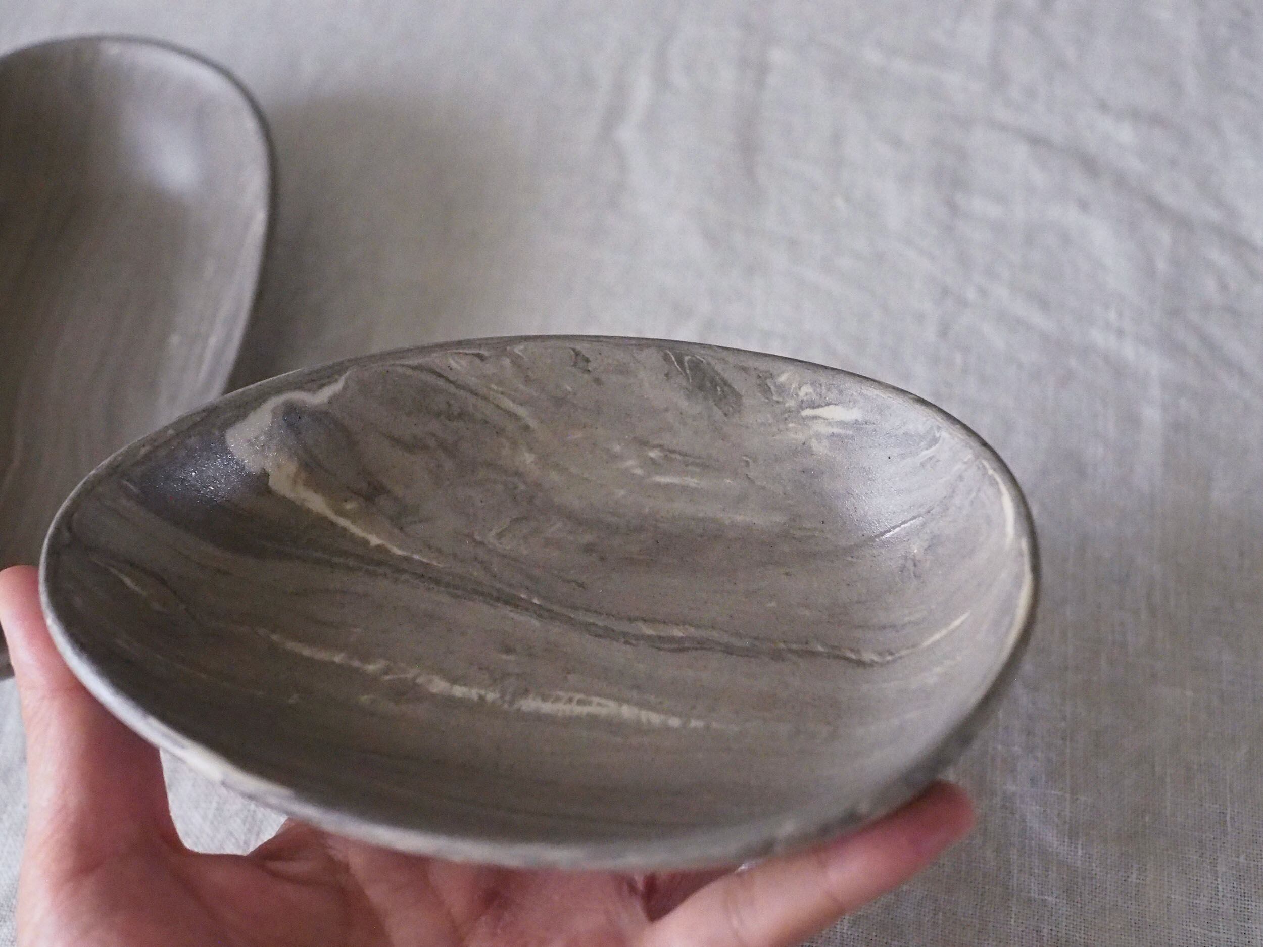 表面にマーブルが施されているのではなく、マーブルに練り込んだ土の塊からカタチを削り出していくというまるで彫刻のような技法です。それは木彫か大理石を削ったかのような表情をみせてくれます。