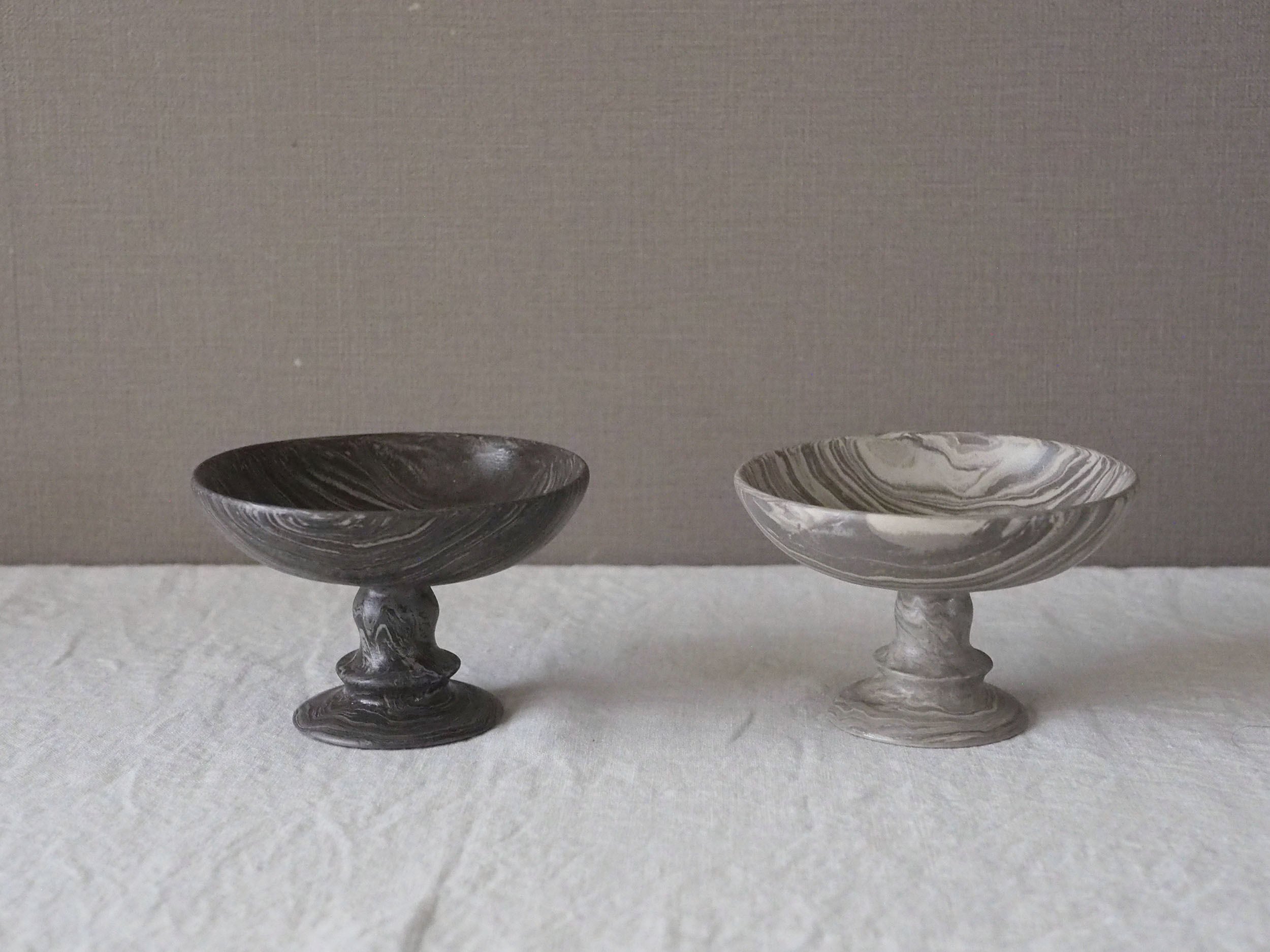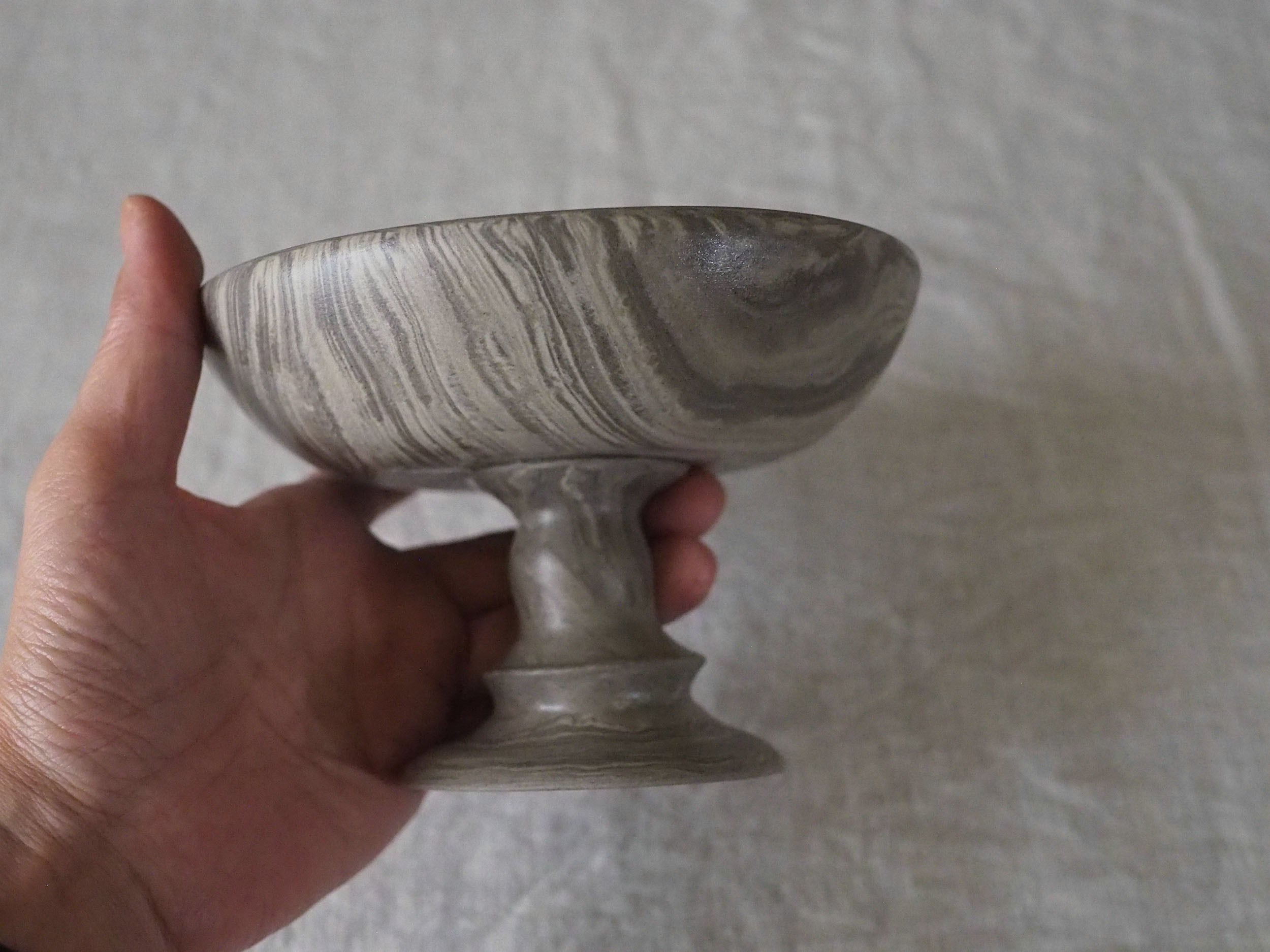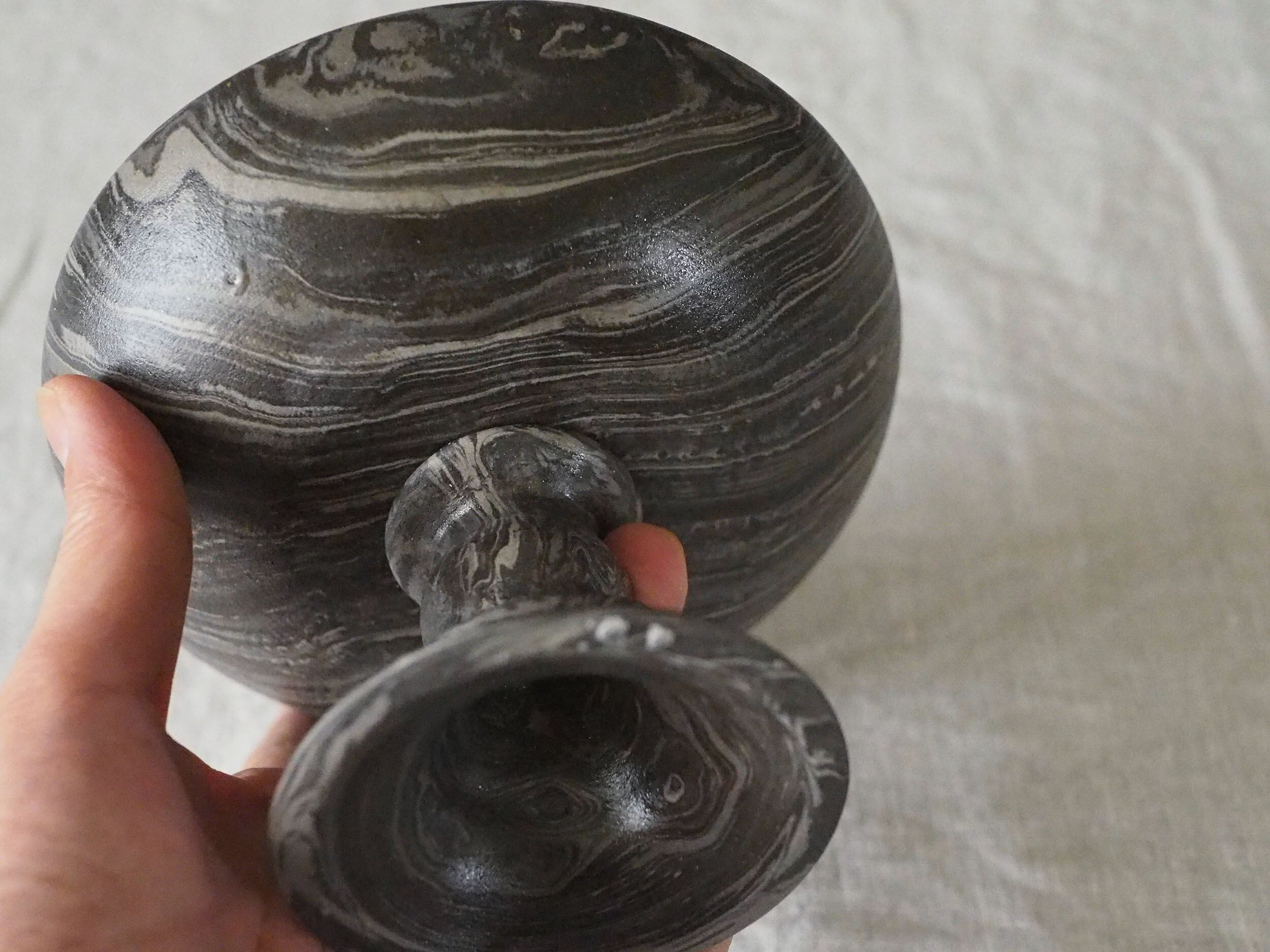 表面にマーブルが施されているのではなく、マーブルに練り込んだ土の塊からカタチを削り出していくというまるで彫刻のような技法です。それは木彫か大理石を削ったかのような表情をみせてくれます。少しイビツな揺らぎが有機的で藤川氏らしい作品です。