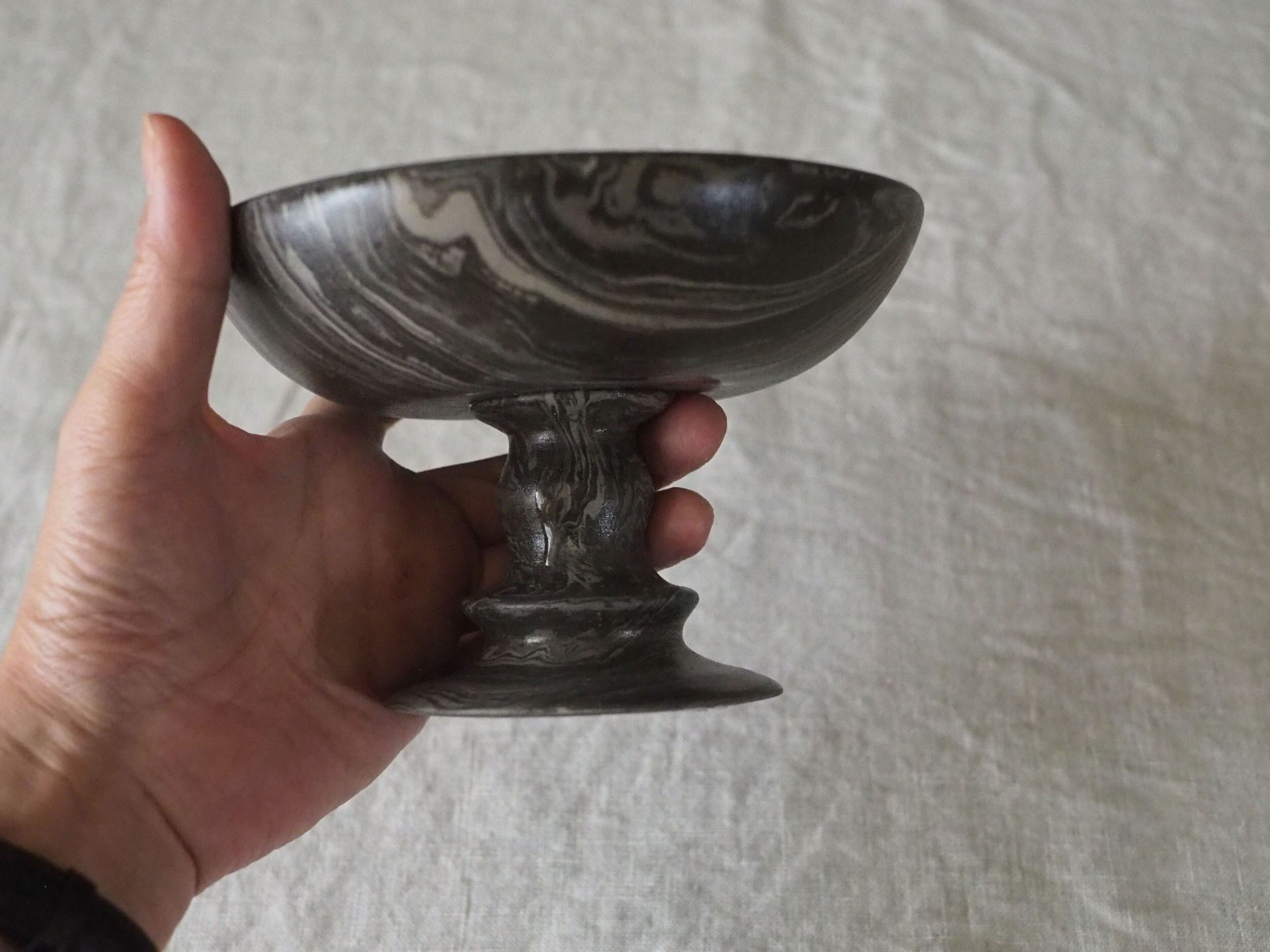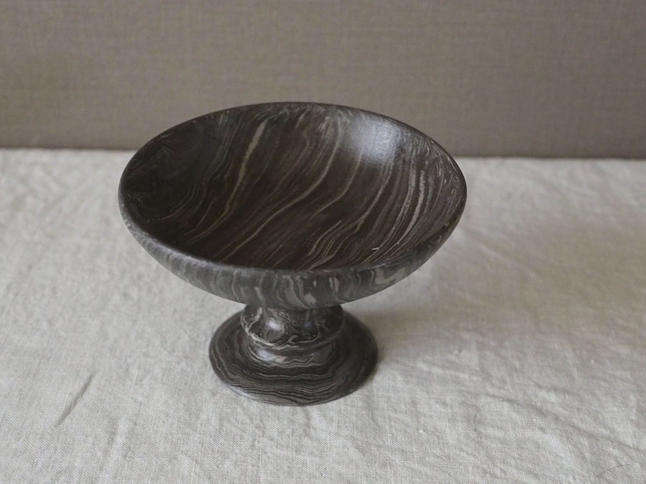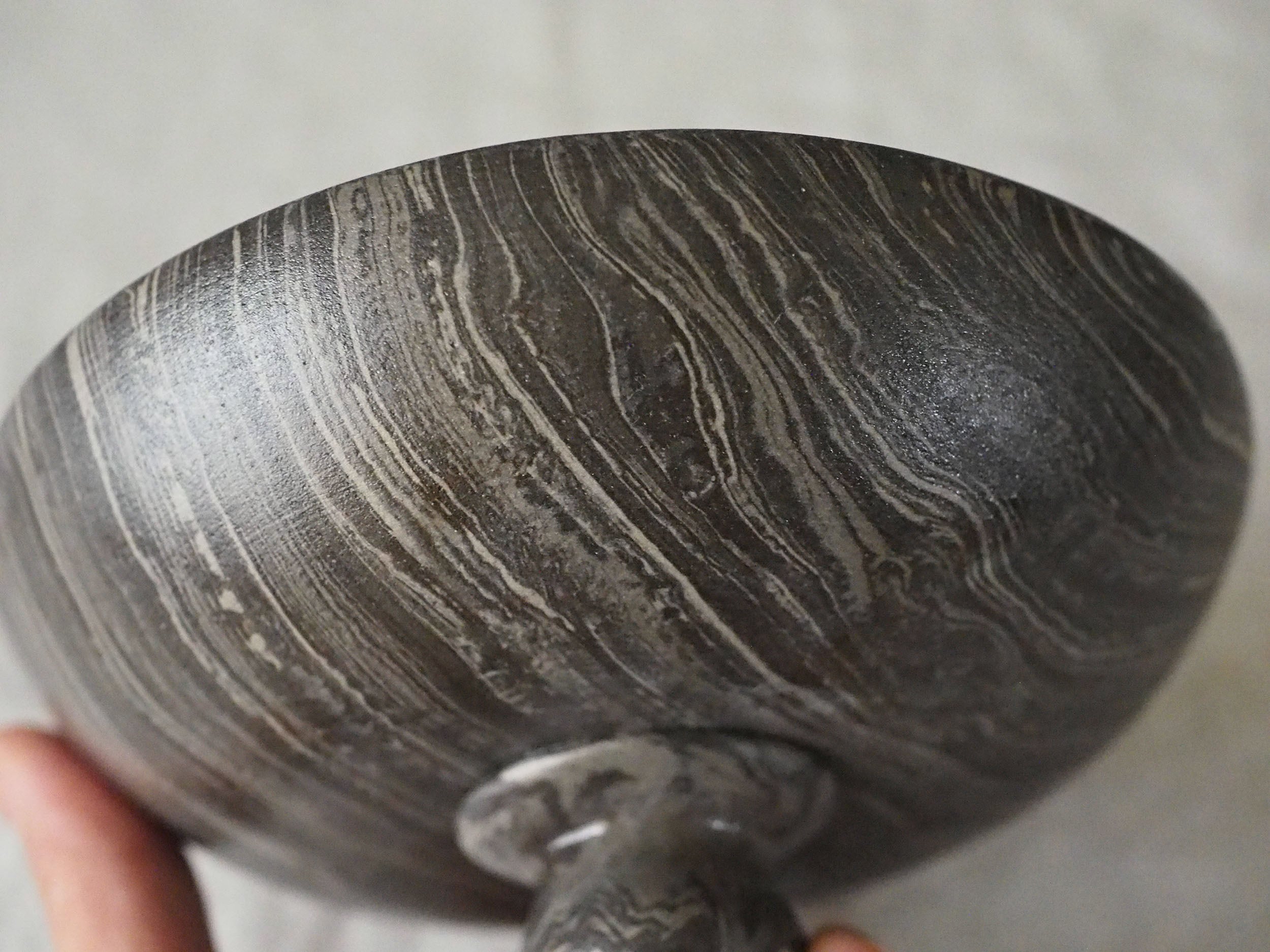 表面にマーブルが施されているのではなく、マーブルに練り込んだ土の塊からカタチを削り出していくというまるで彫刻のような技法です。それは木彫か大理石を削ったかのような表情をみせてくれます。少しイビツな揺らぎが有機的で藤川氏らしい作品です。