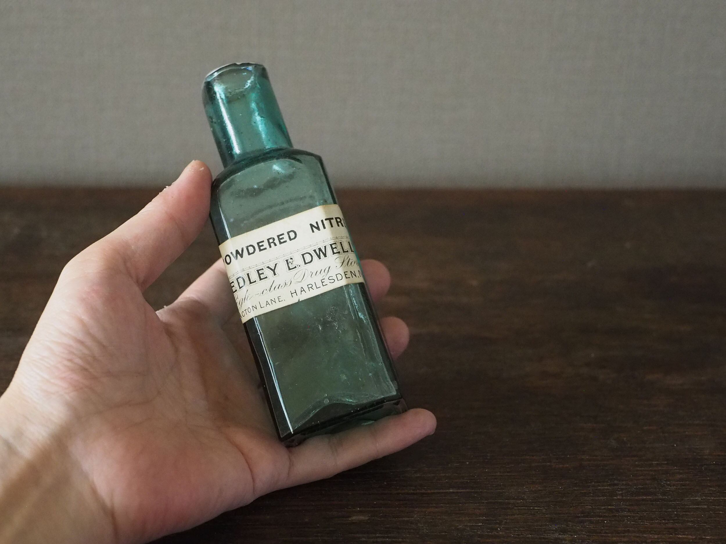 ラベルの文字を読み込んでみると、1890年代〜1900年代初期、イギリス・ロンドンのハレスデン(Harlesden)にあった薬局「Edley E. Dwelly」で実際に使用されていた薬瓶のようです。