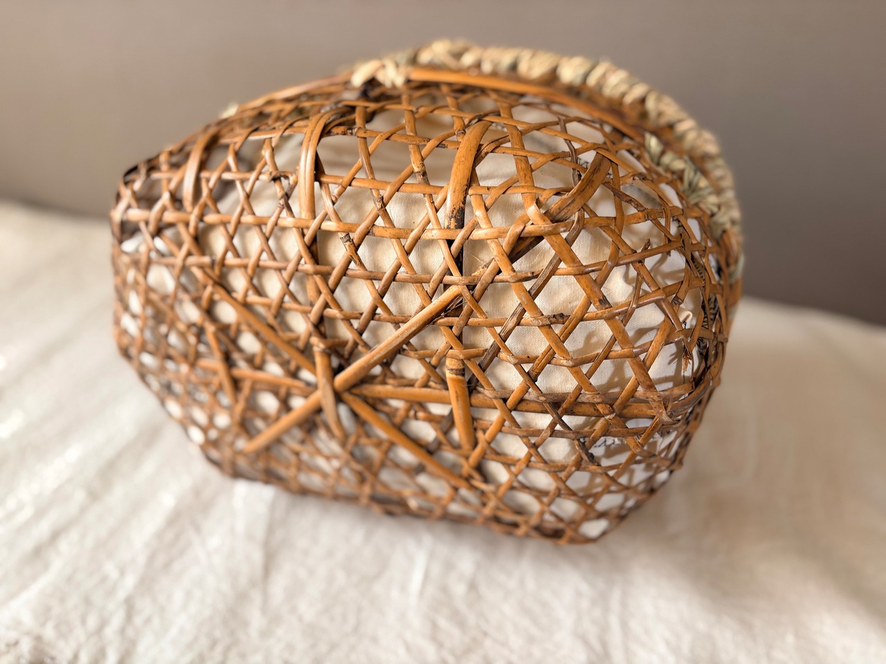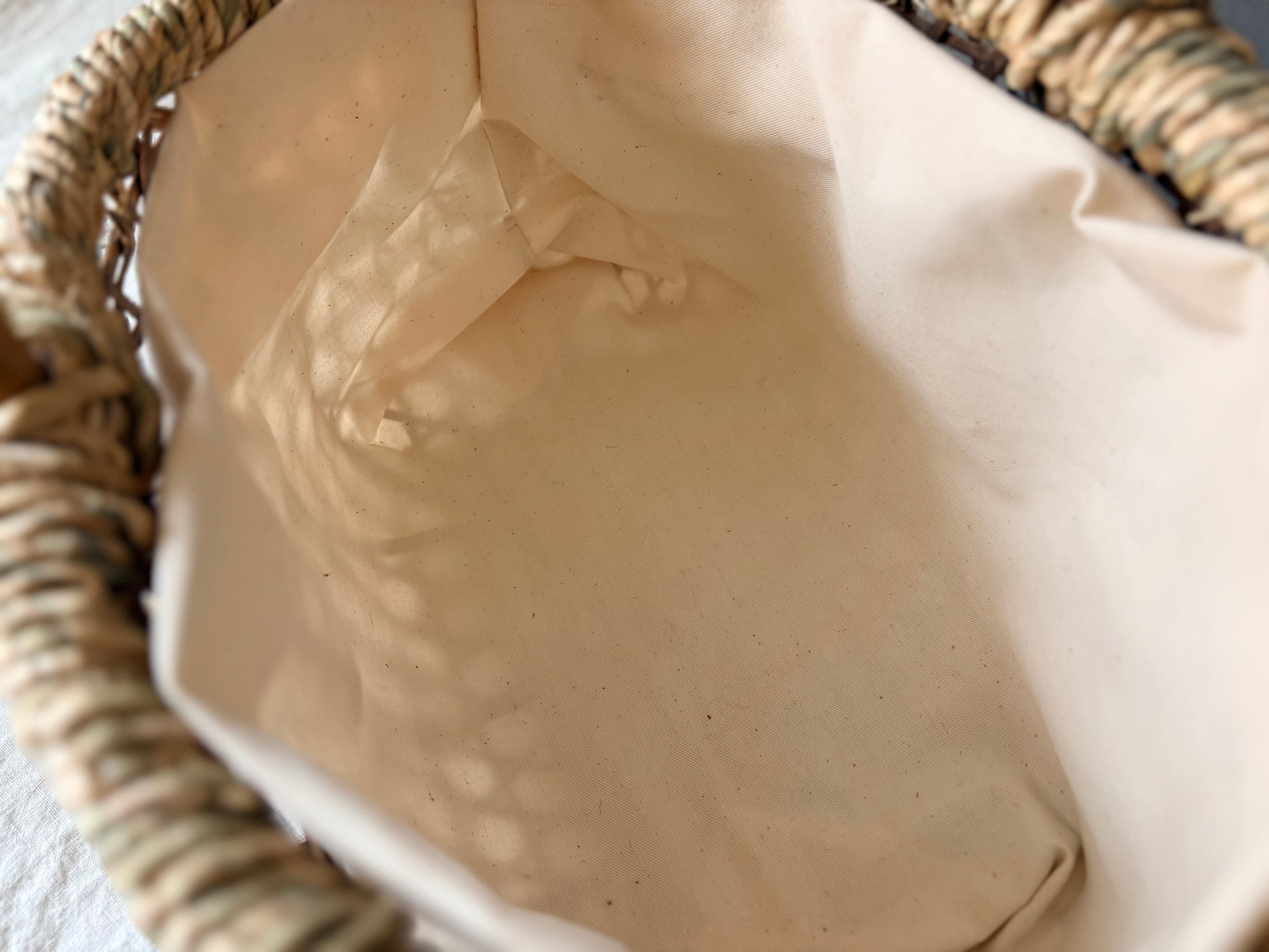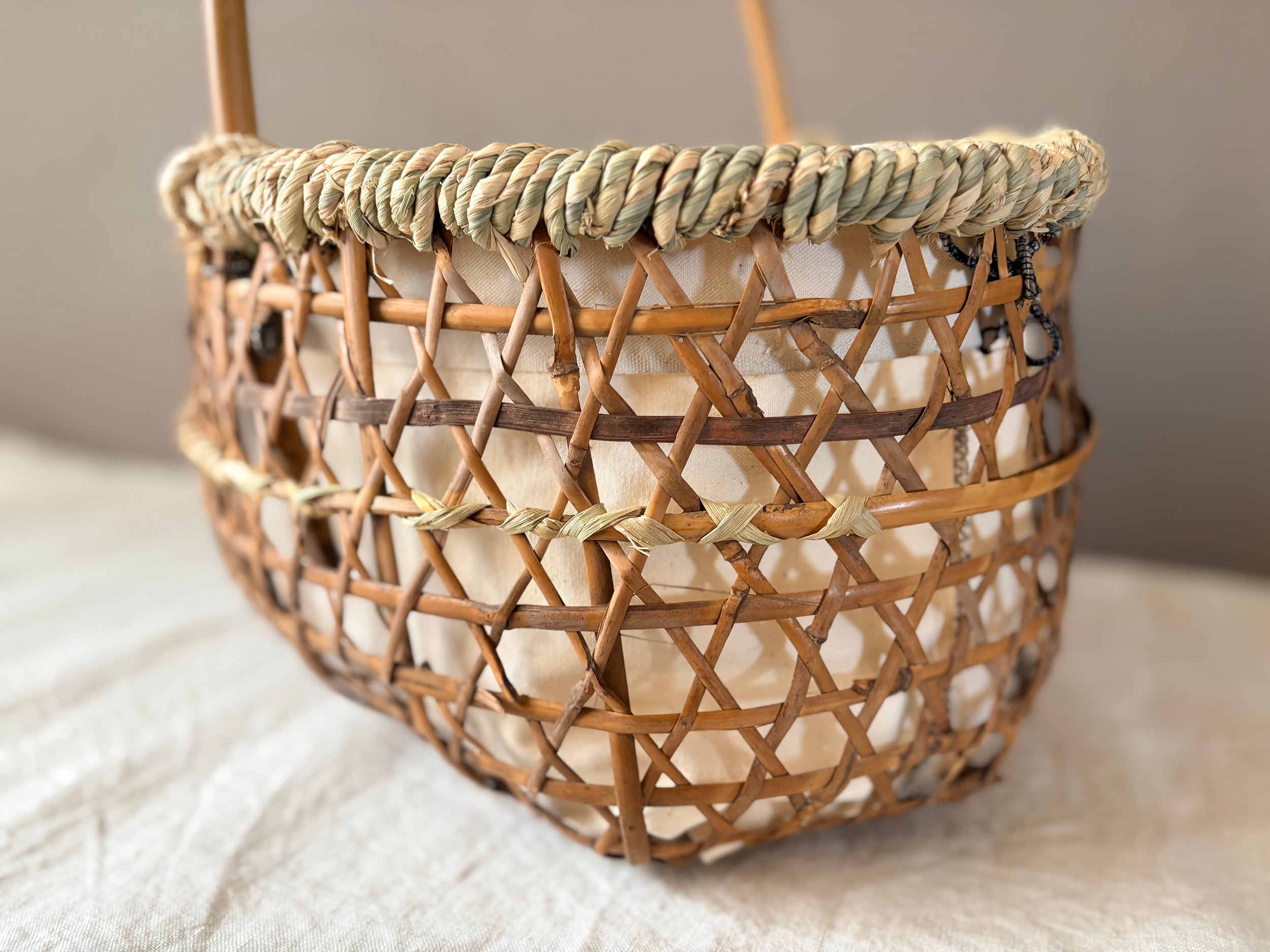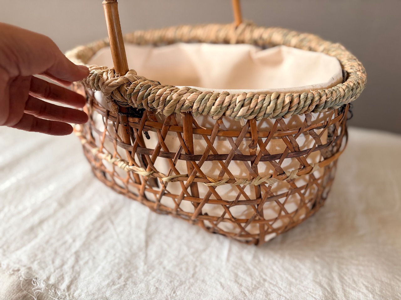 埃を落とし、水洗いをして拭きあげ、ビニールテープで補修していた部分を藁や皮革で補修をし、どうしてもピカピカにはならない籠の内側にコットンで袋を付けました。(取り外して洗うことが出来ます!)なんて素敵な籠になったのだろうか!とうっとりした次第です。