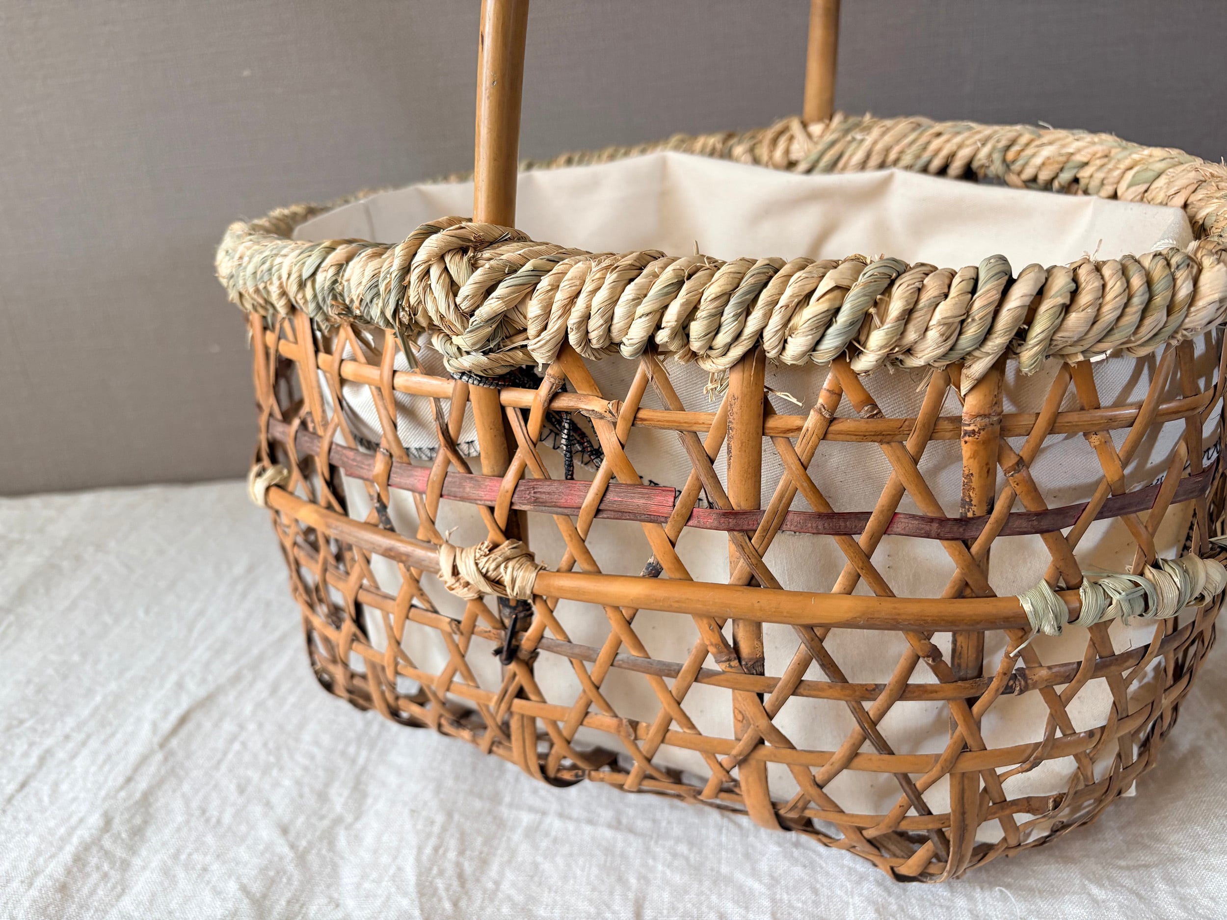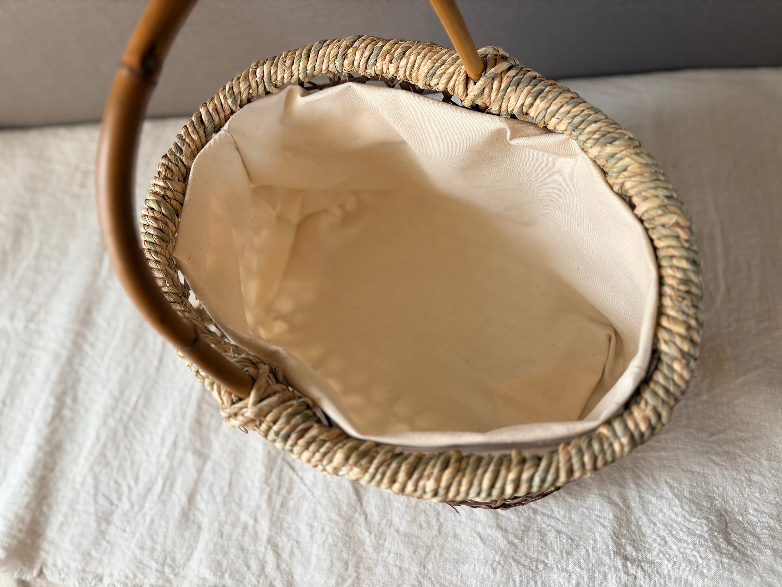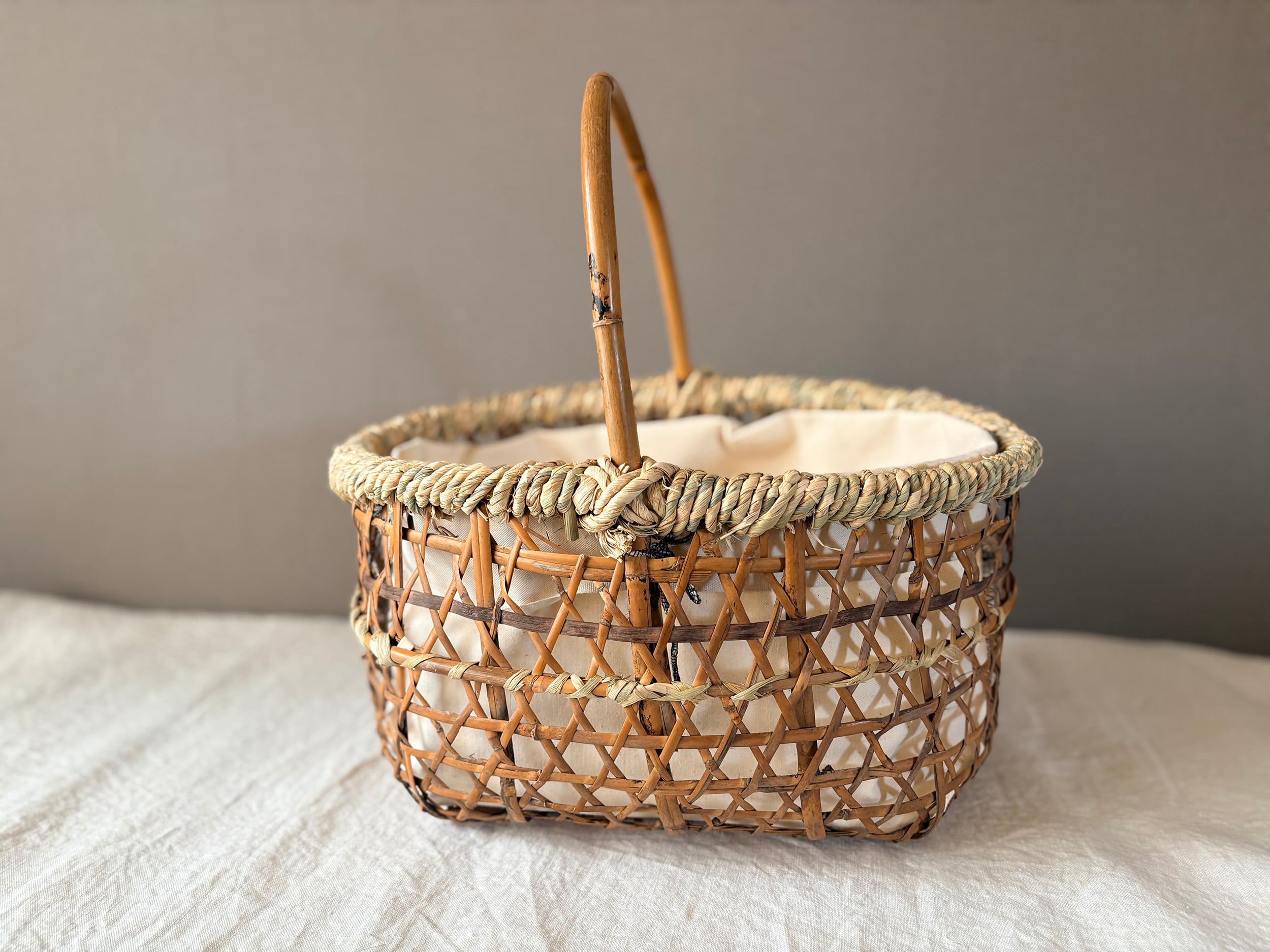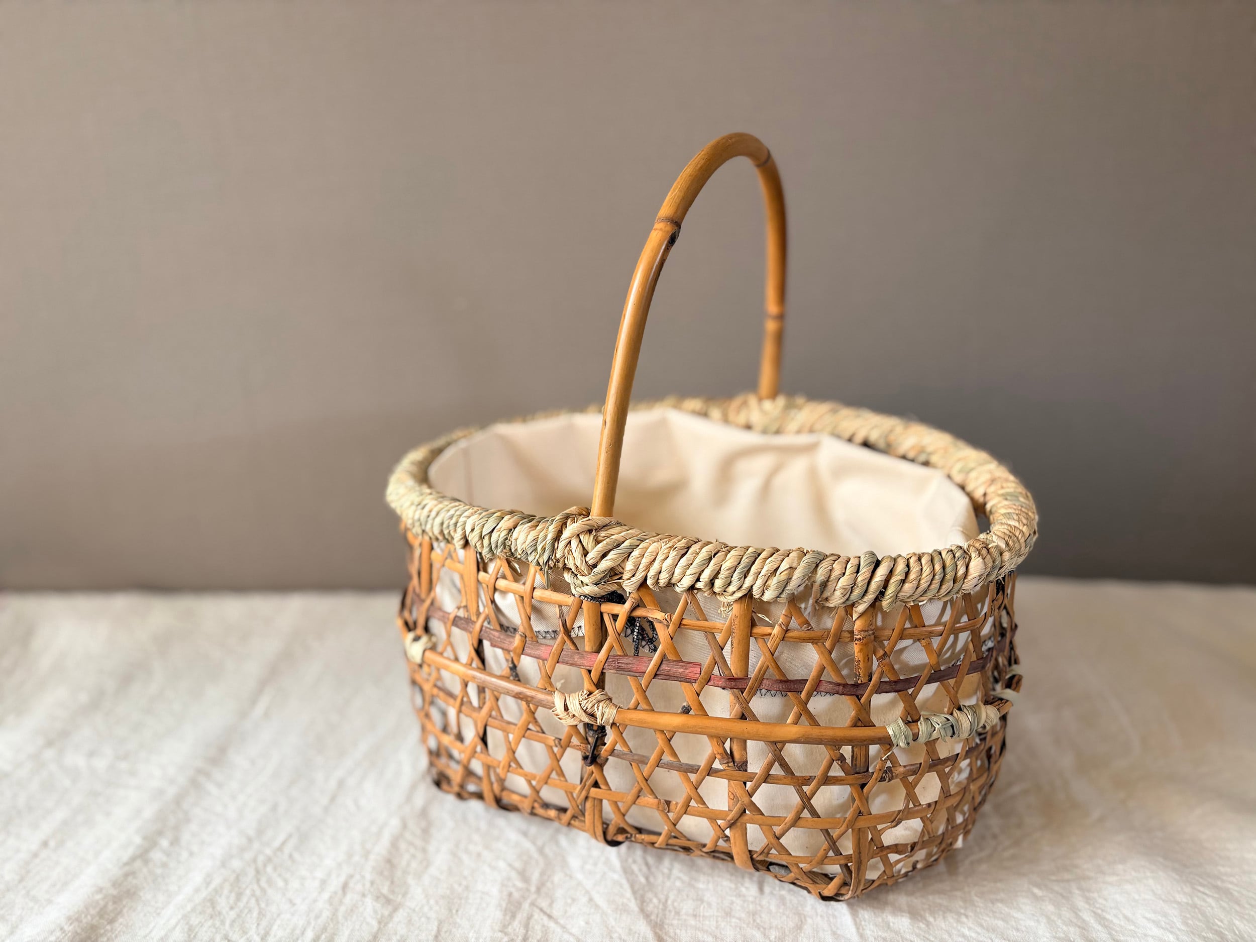 埃を落とし、水洗いをして拭きあげ、ビニールテープで補修していた部分を藁や皮革で補修をし、どうしてもピカピカにはならない籠の内側にコットンで袋を付けました。(取り外して洗うことが出来ます!)なんて素敵な籠になったのだろうか!とうっとりした次第です。