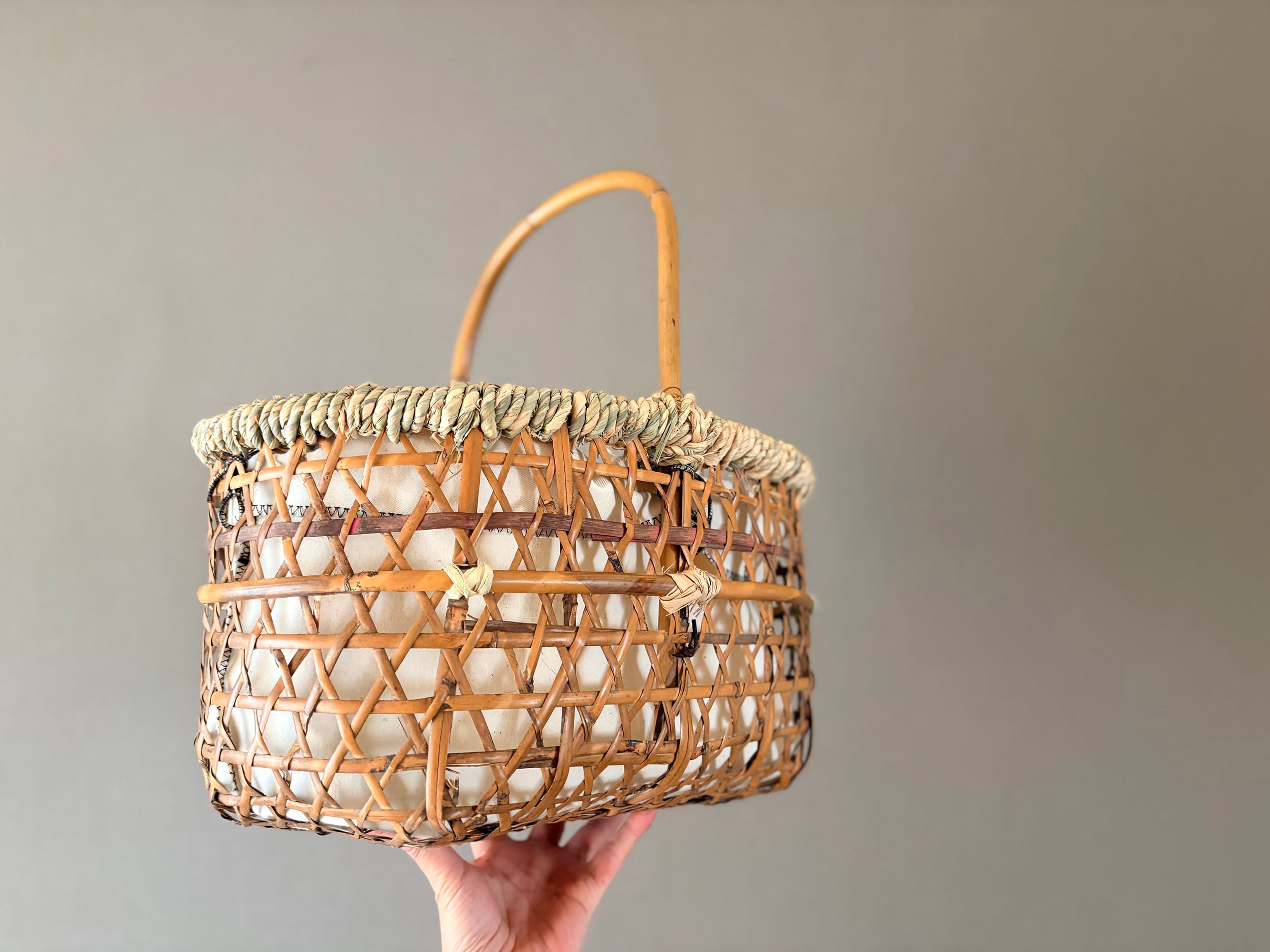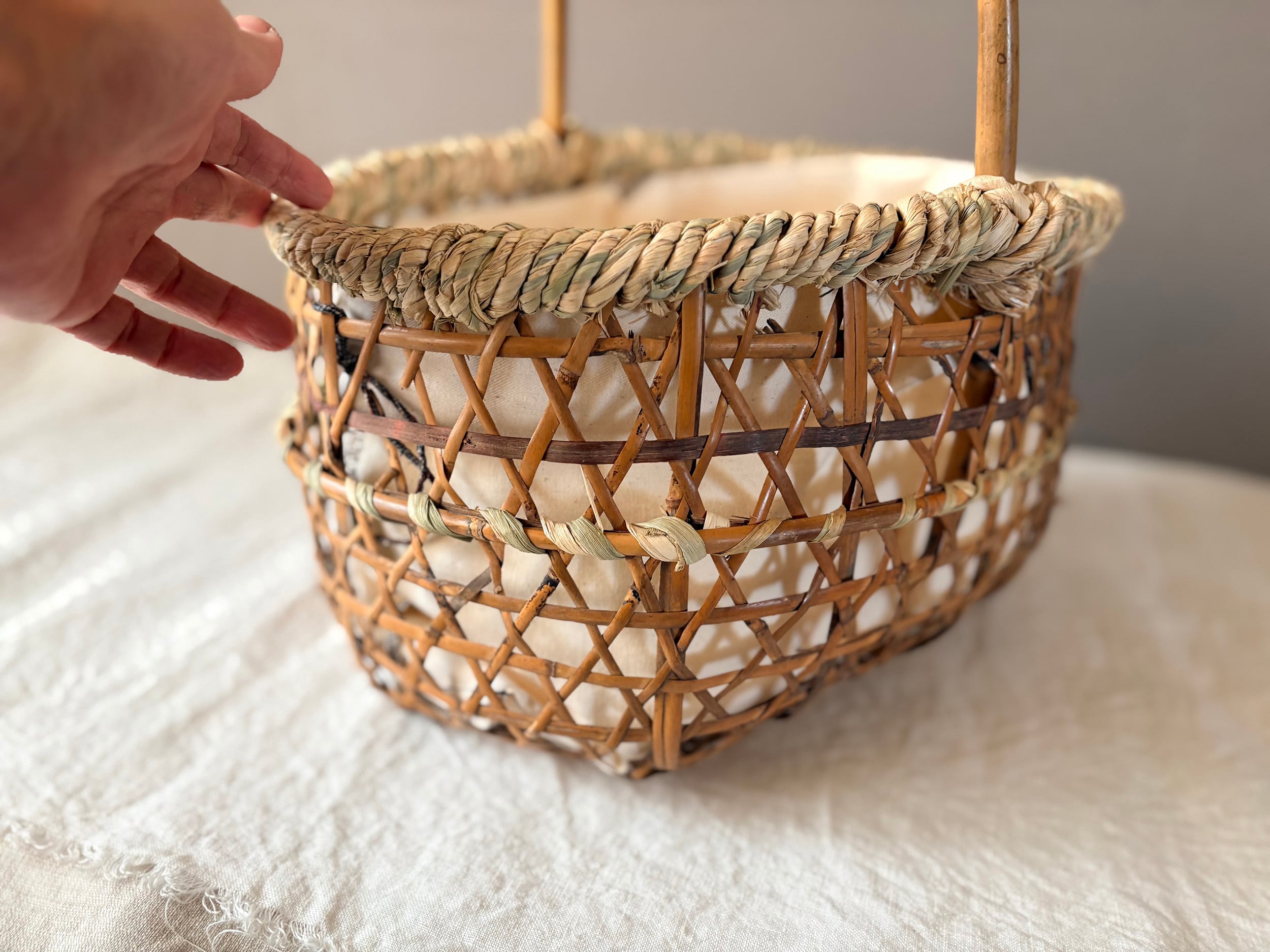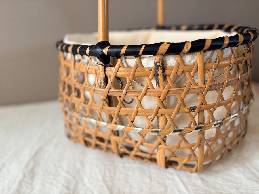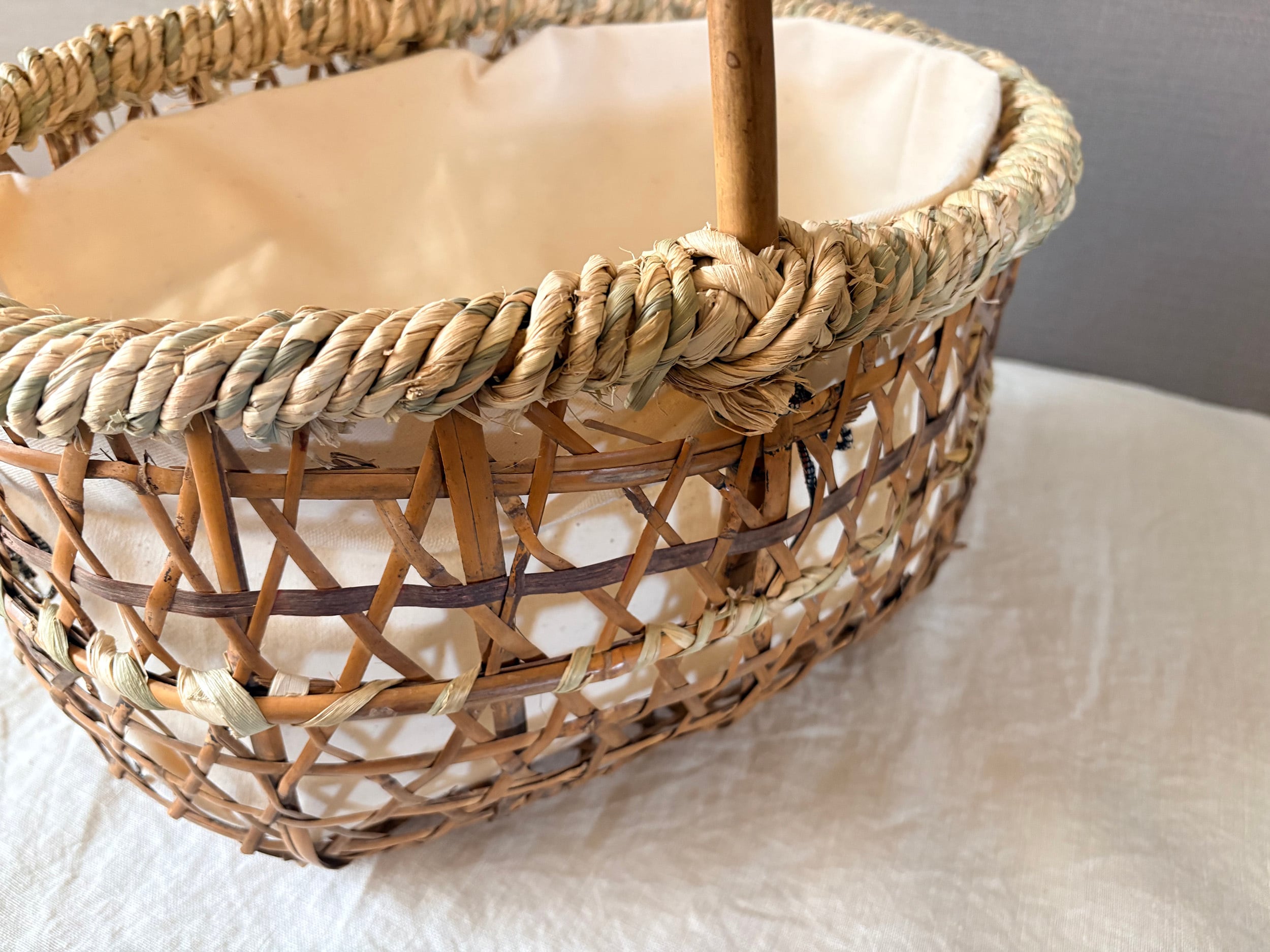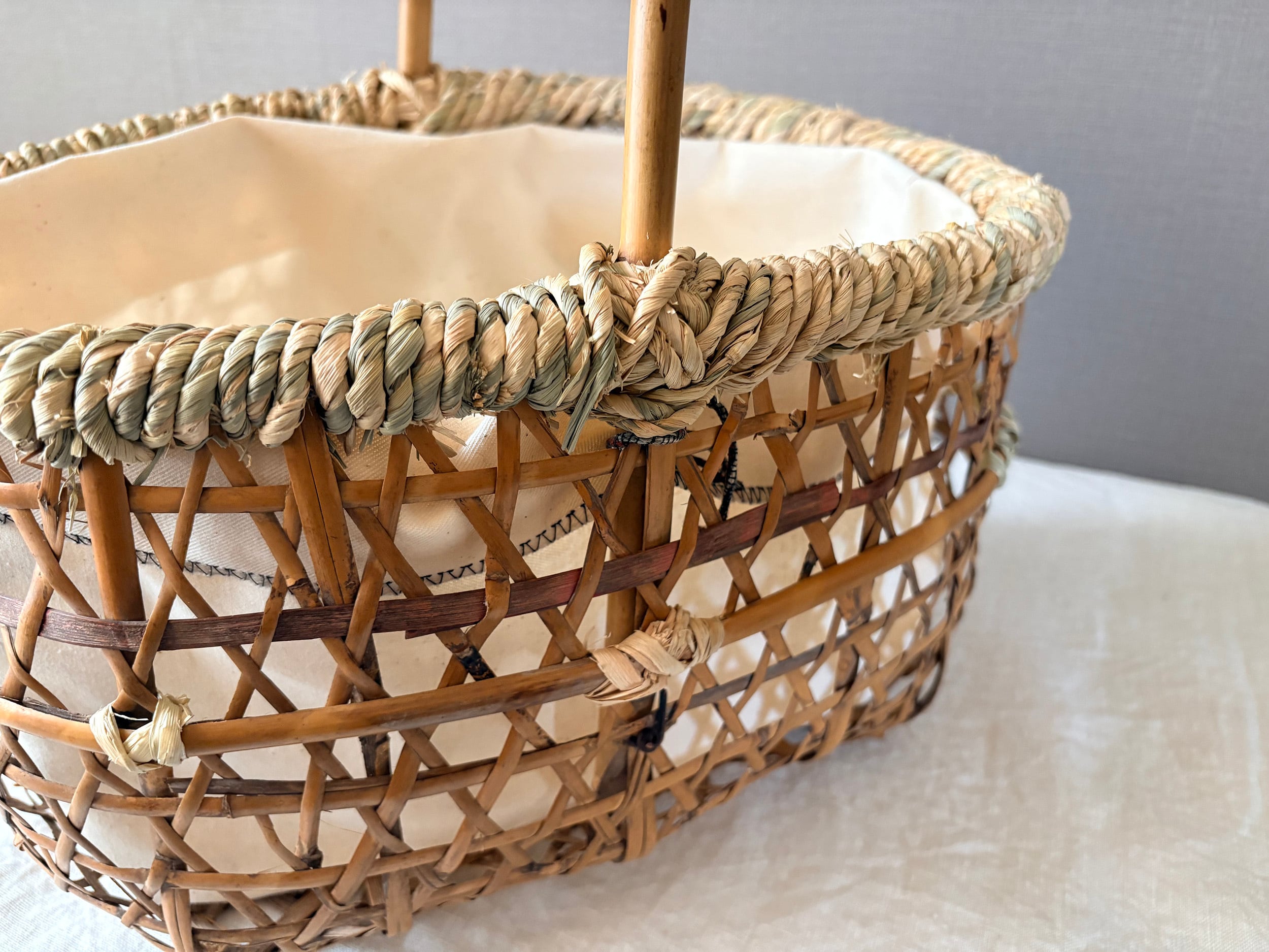 埃を落とし、水洗いをして拭きあげ、ビニールテープで補修していた部分を藁や皮革で補修をし、どうしてもピカピカにはならない籠の内側にコットンで袋を付けました。(取り外して洗うことが出来ます!)なんて素敵な籠になったのだろうか!とうっとりした次第です。