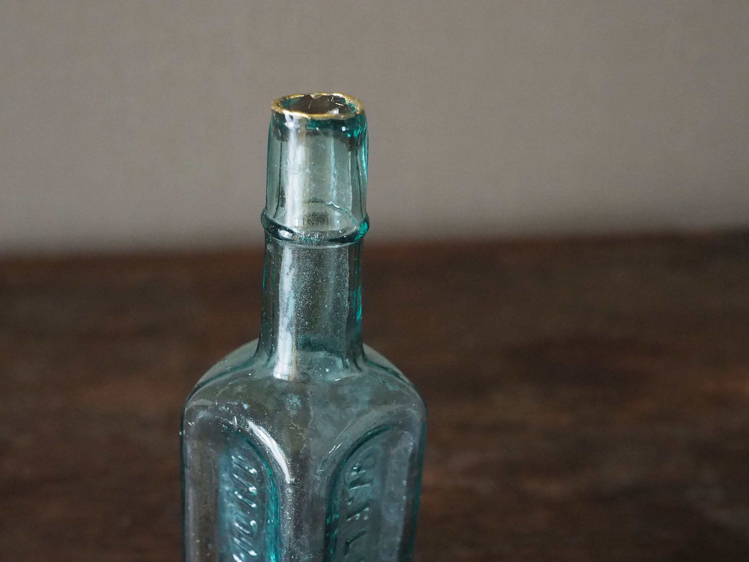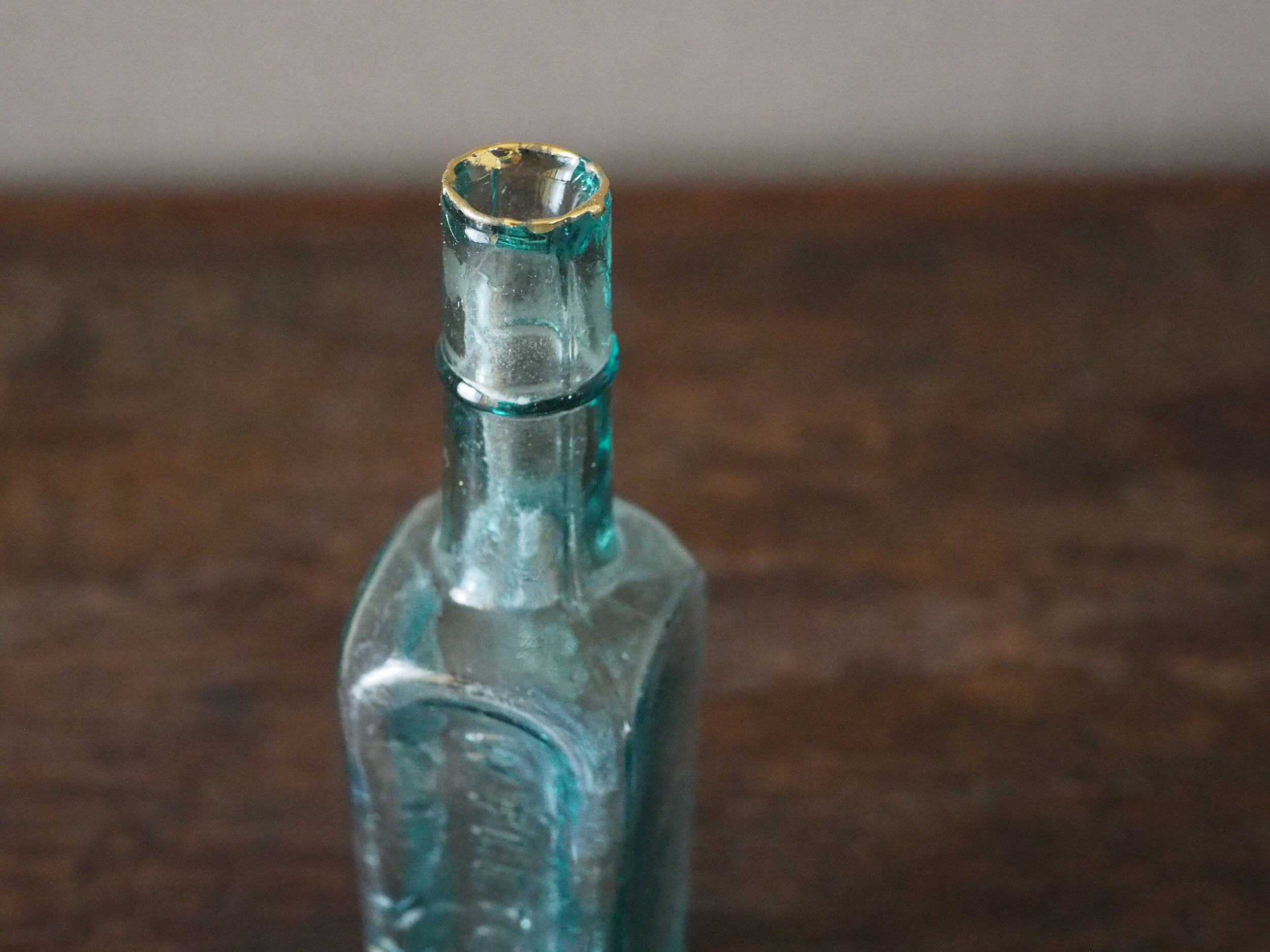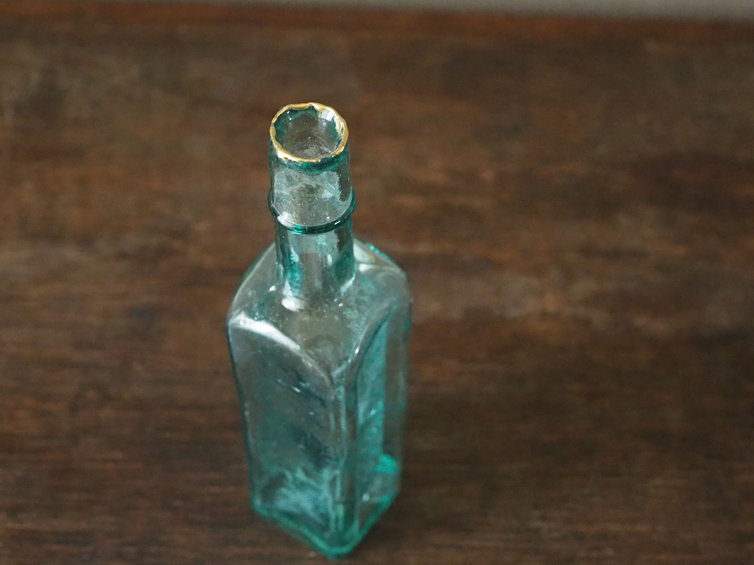 怪我をしないよう欠けたところにヤスリをかけ滑らかに、それから軽く水拭きをして注ぎ口を樹脂で金継ぎ(真鍮仕上げ)しました。アクアブルーの気泡が入ったガラスにブラスが映えますね。ブラスはだんだんと酸化していきますが、その経年変化をボトルの雰囲気とともに楽しむことができます。