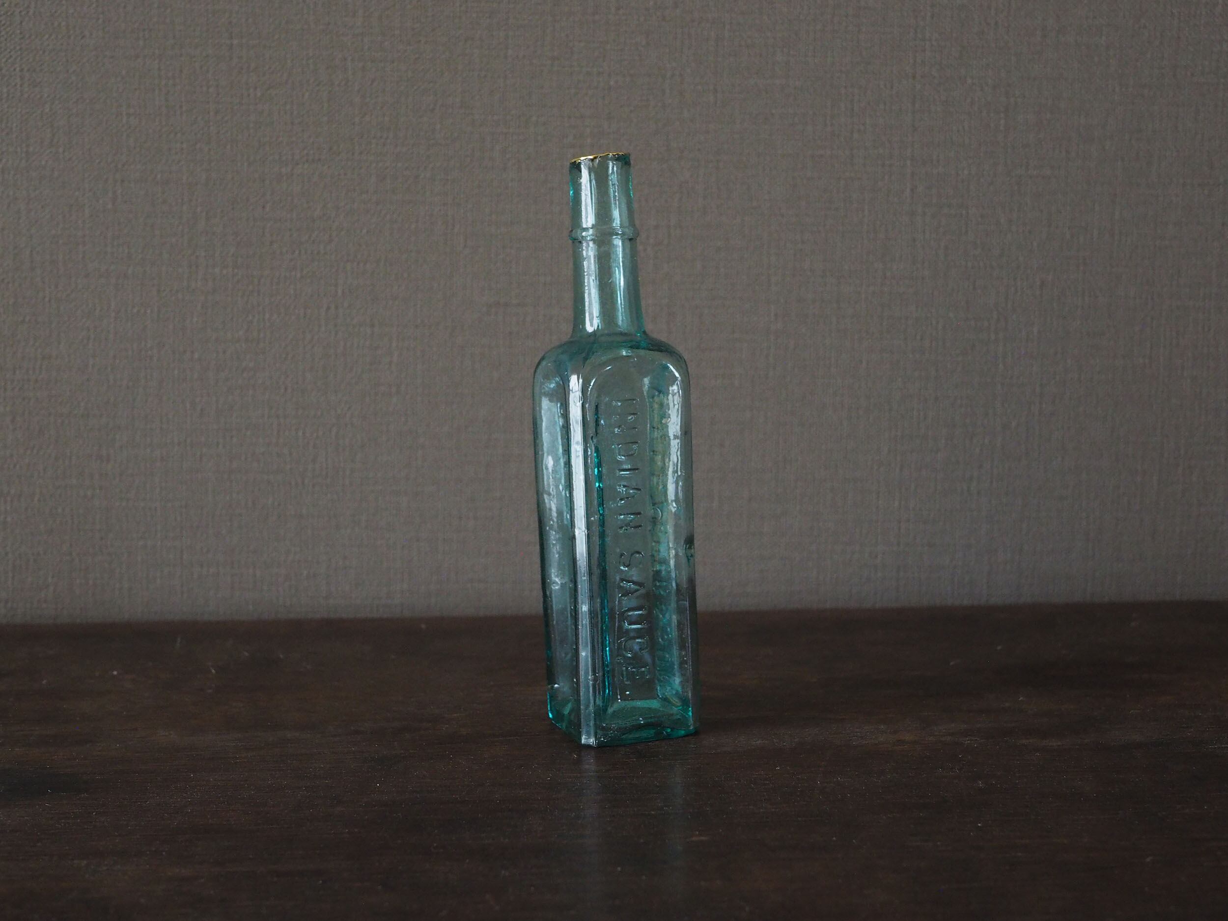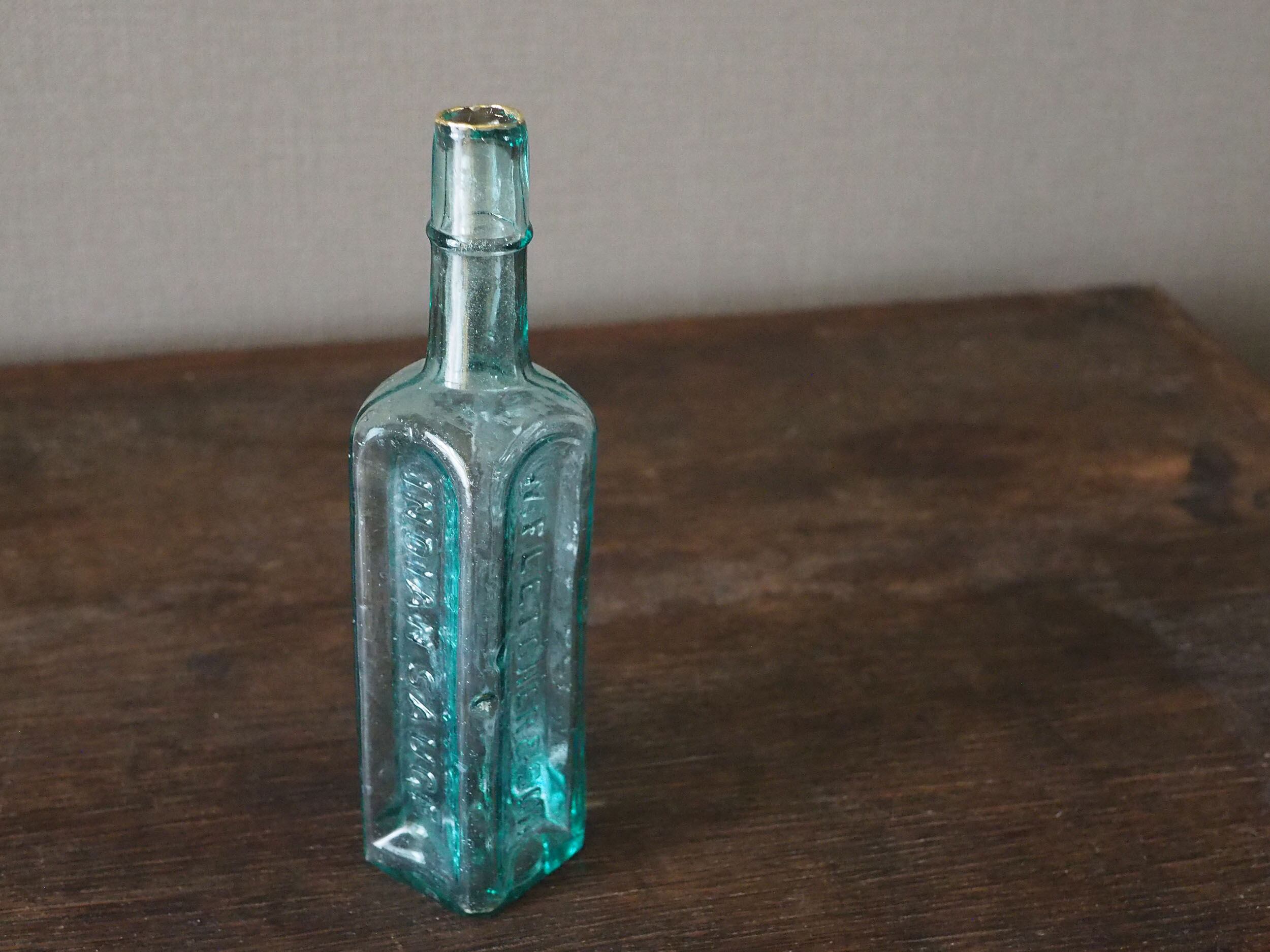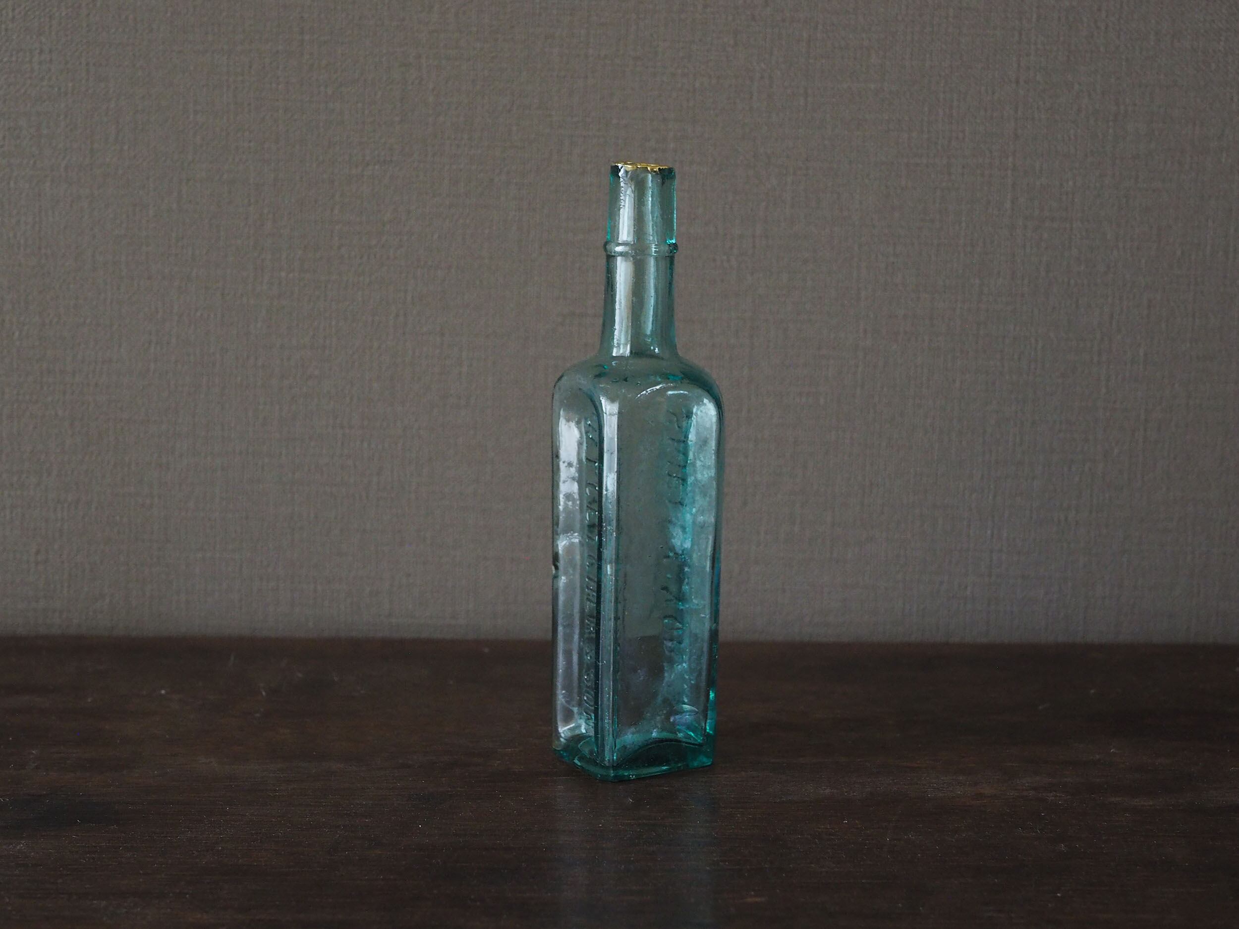 怪我をしないよう欠けたところにヤスリをかけ滑らかに、それから軽く水拭きをして注ぎ口を樹脂で金継ぎ(真鍮仕上げ)しました。アクアブルーの気泡が入ったガラスにブラスが映えますね。ブラスはだんだんと酸化していきますが、その経年変化をボトルの雰囲気とともに楽しむことができます。