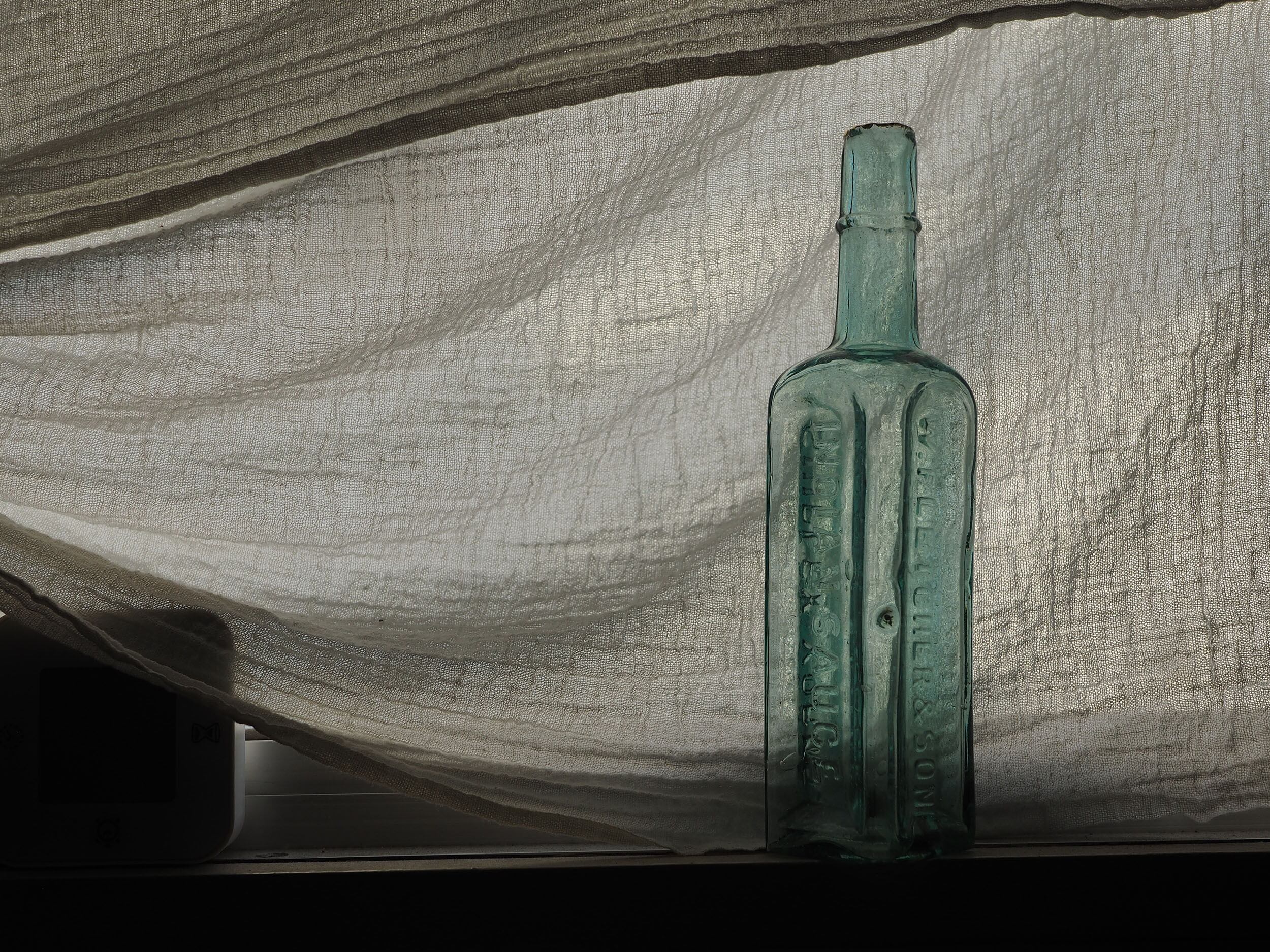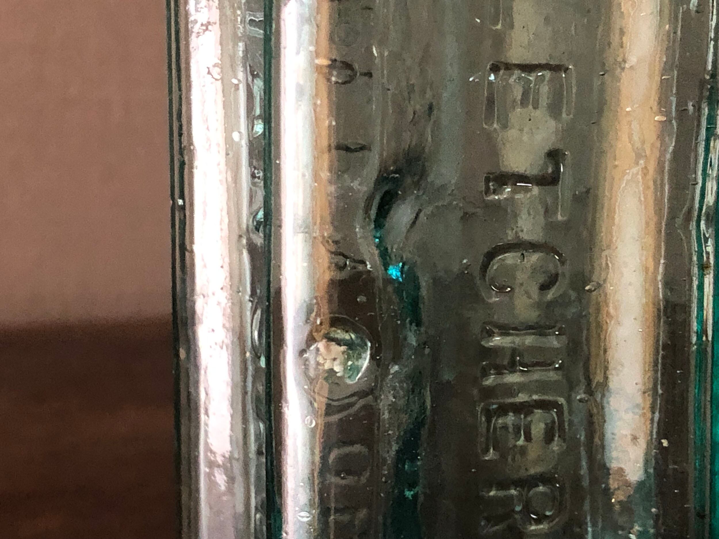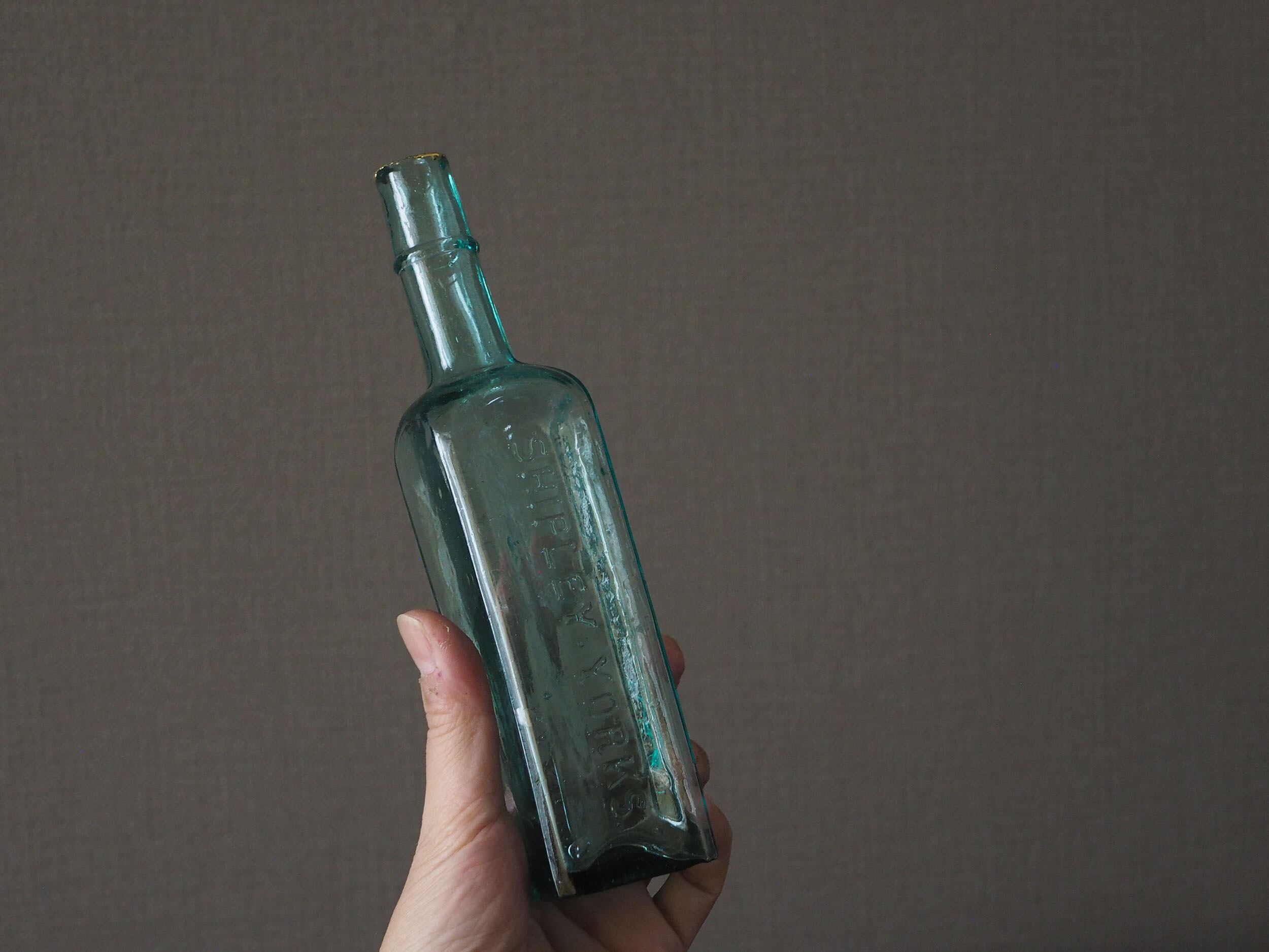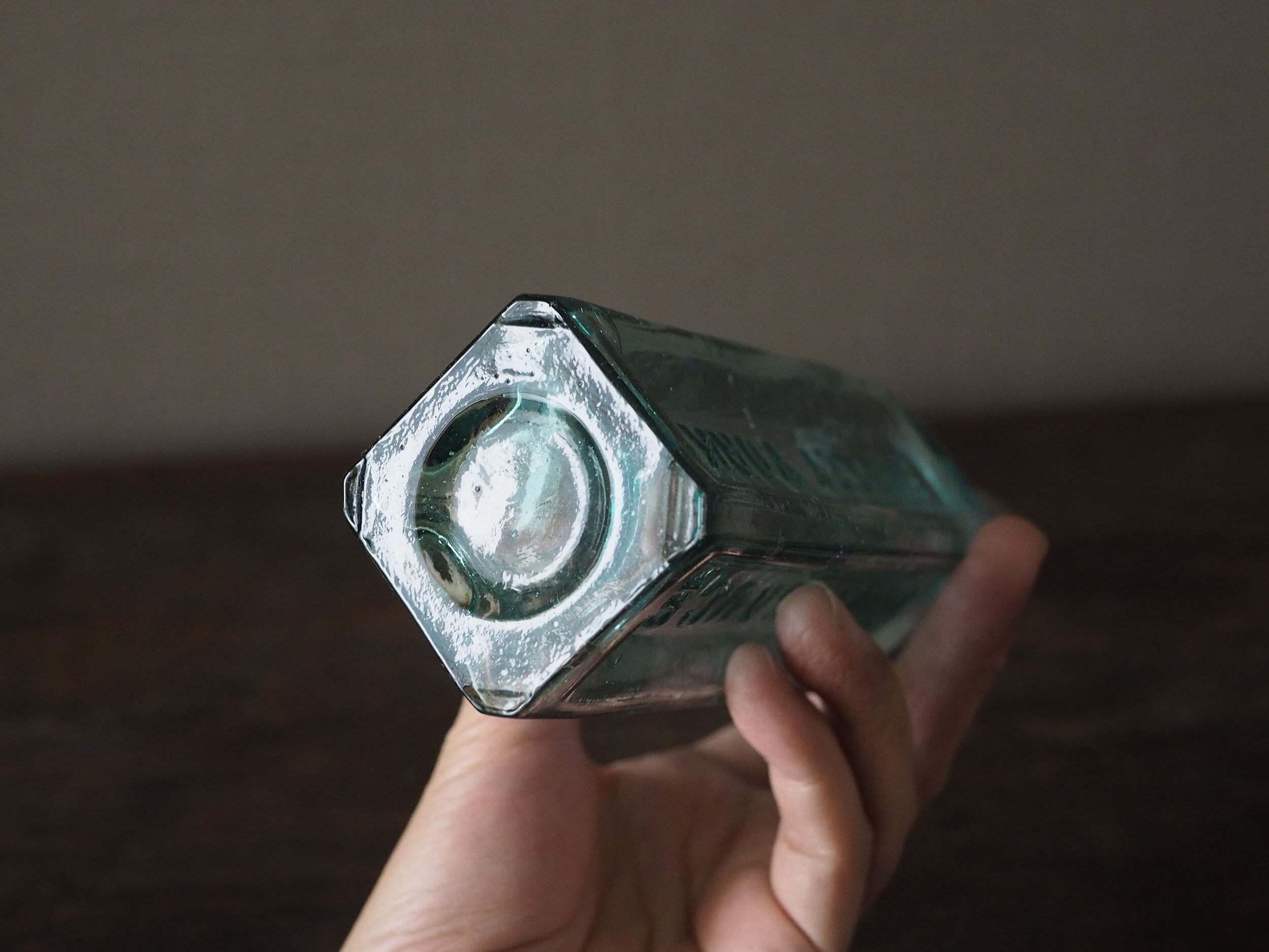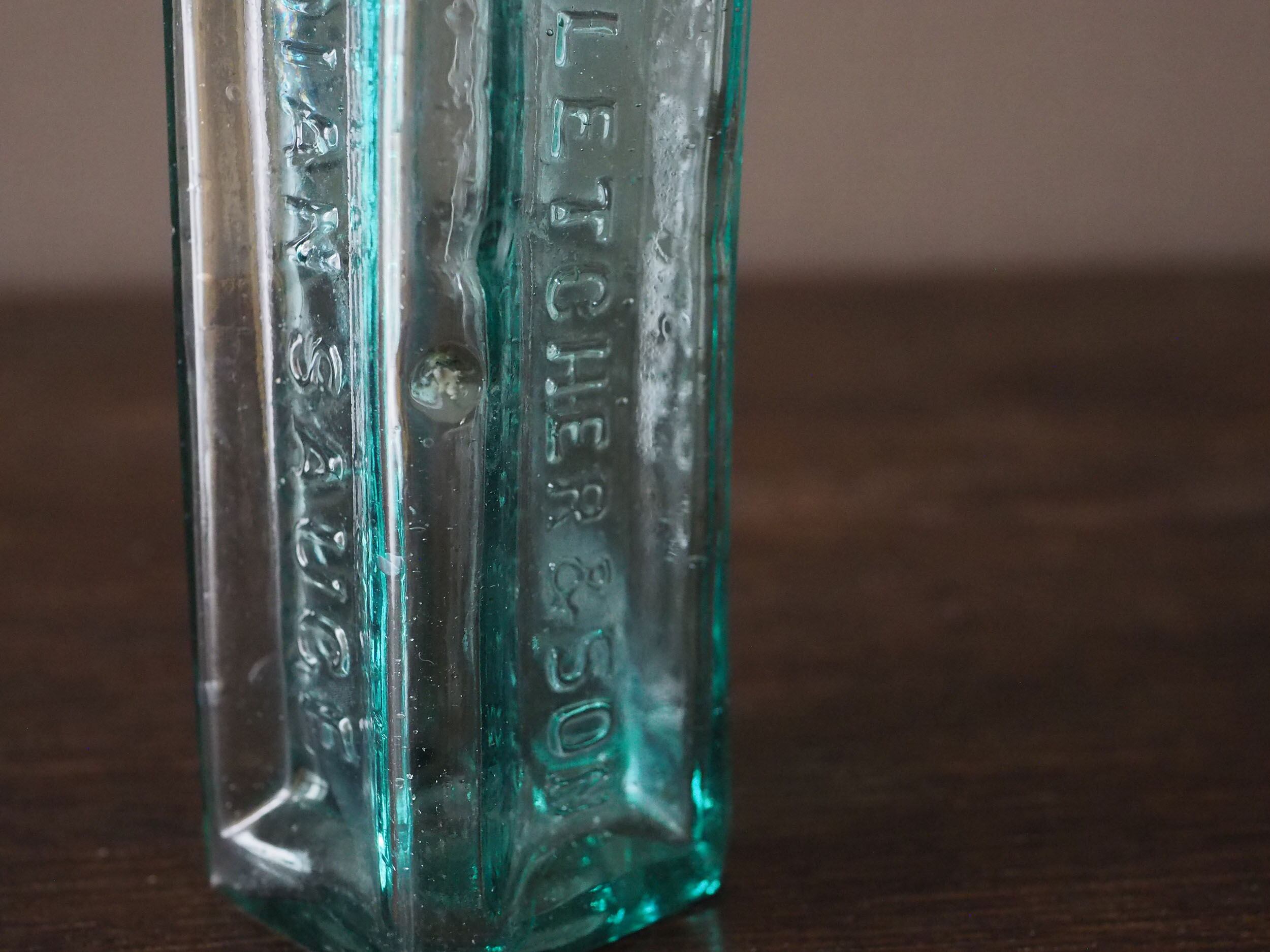19世紀末から1920年頃にかけてイギリスで主流だった「2パーツ・モールド(二分割型)」という半手吹き・半機械的な製法で作られています。サイドの継ぎ目(シーム)、「気泡」と「ゆらぎ」、不純物によるアクアブルーが時代を象徴しています。