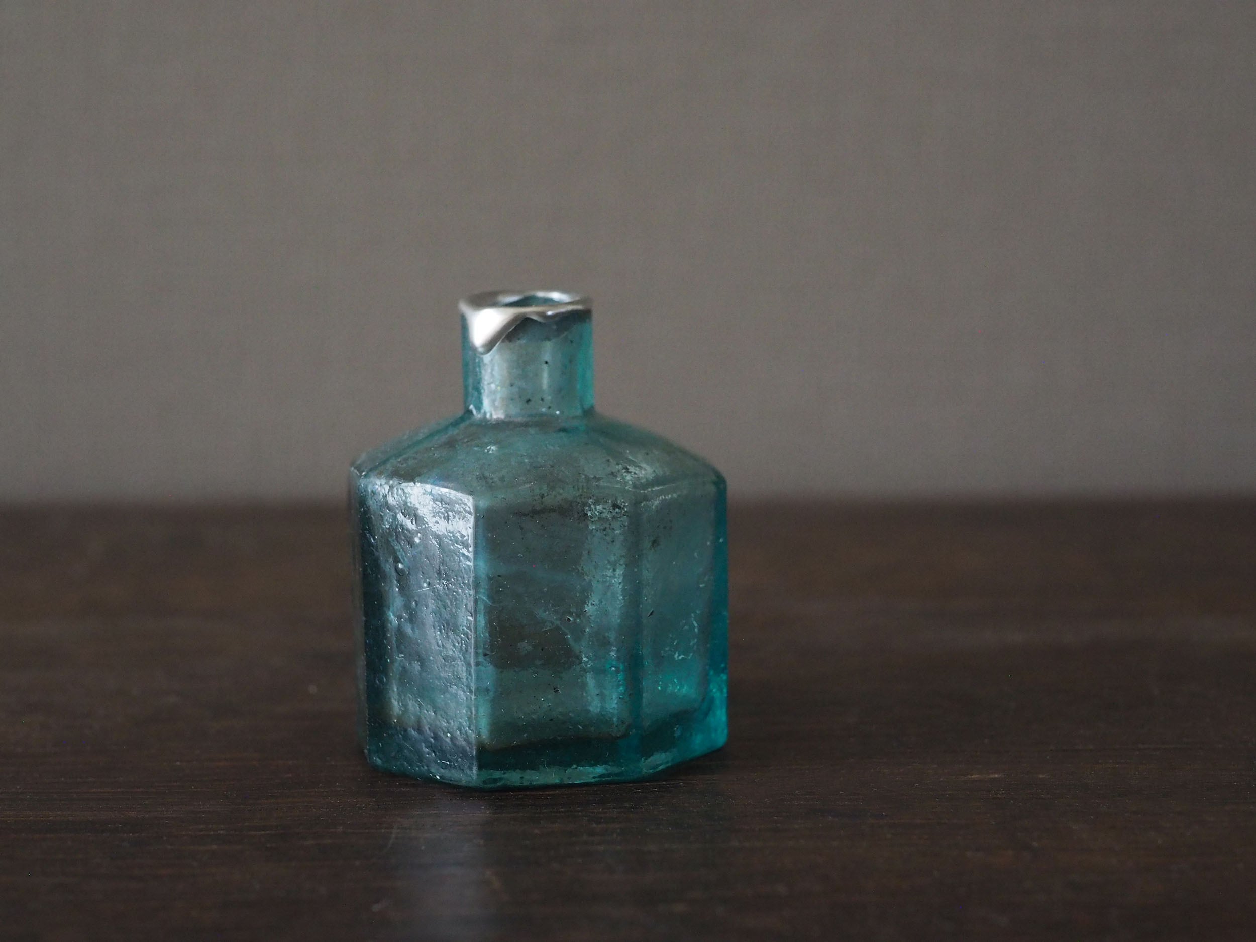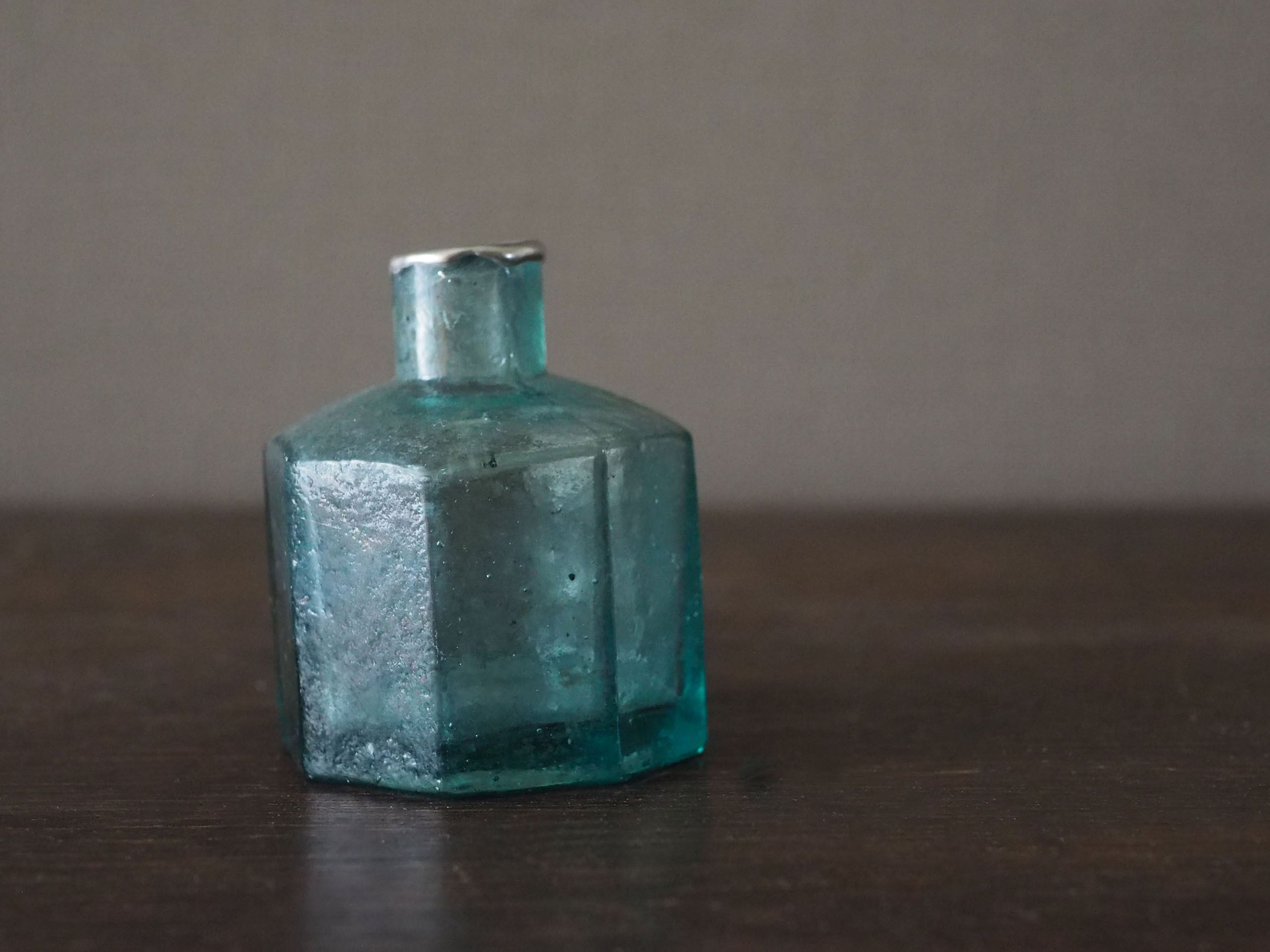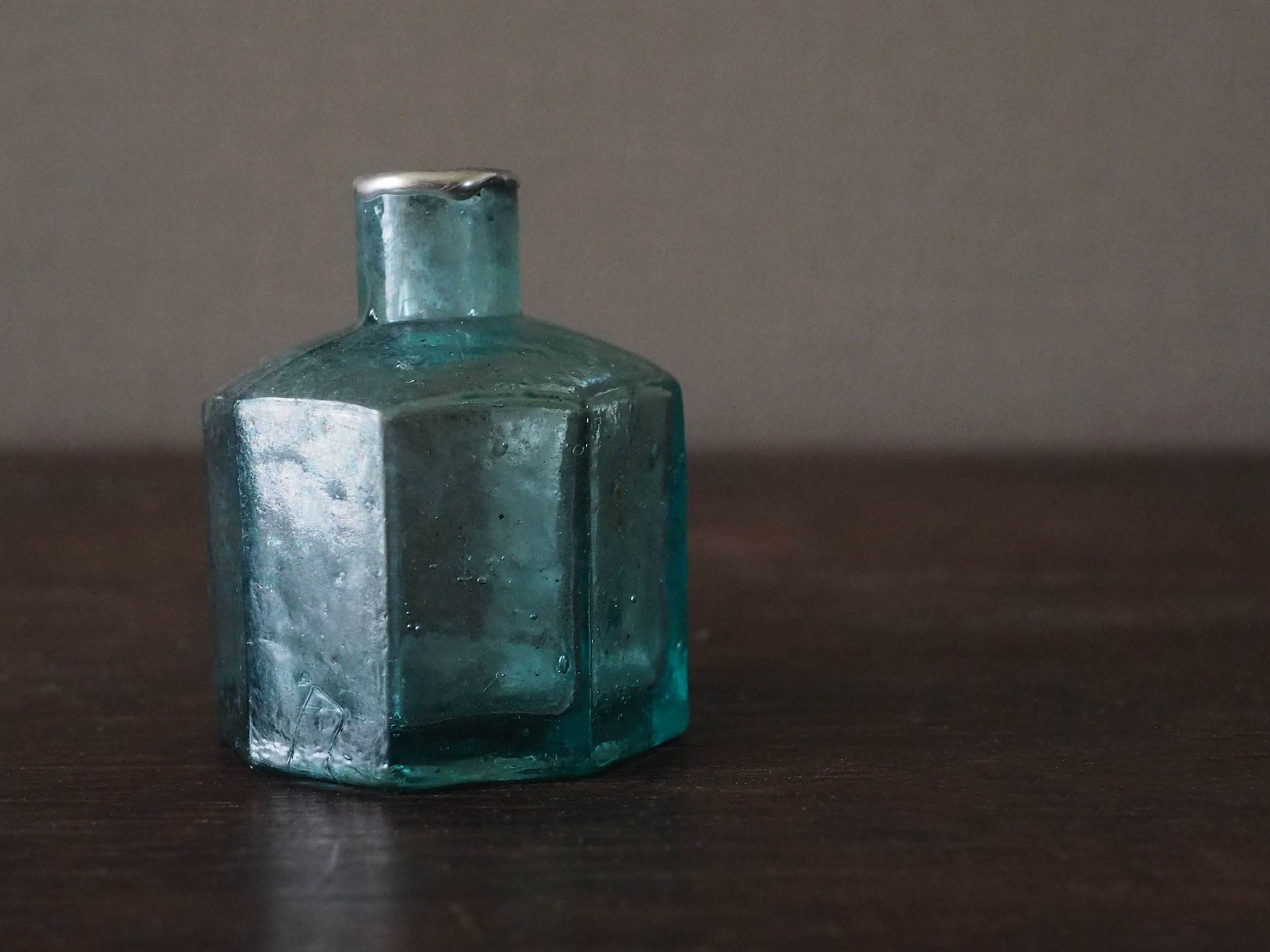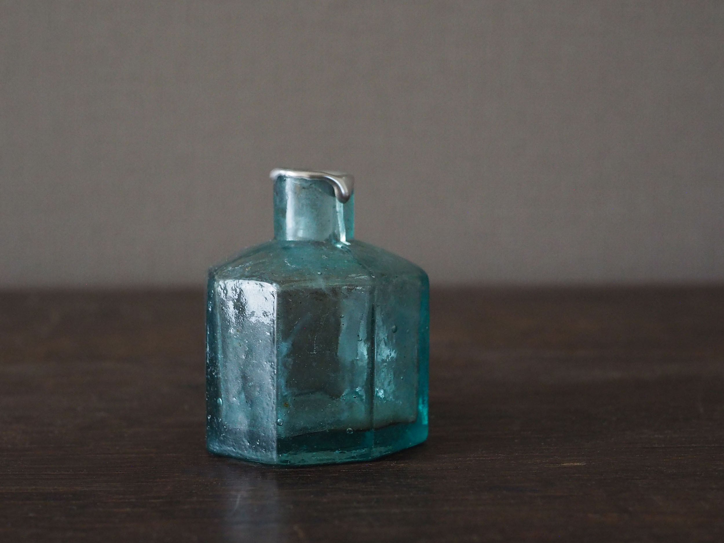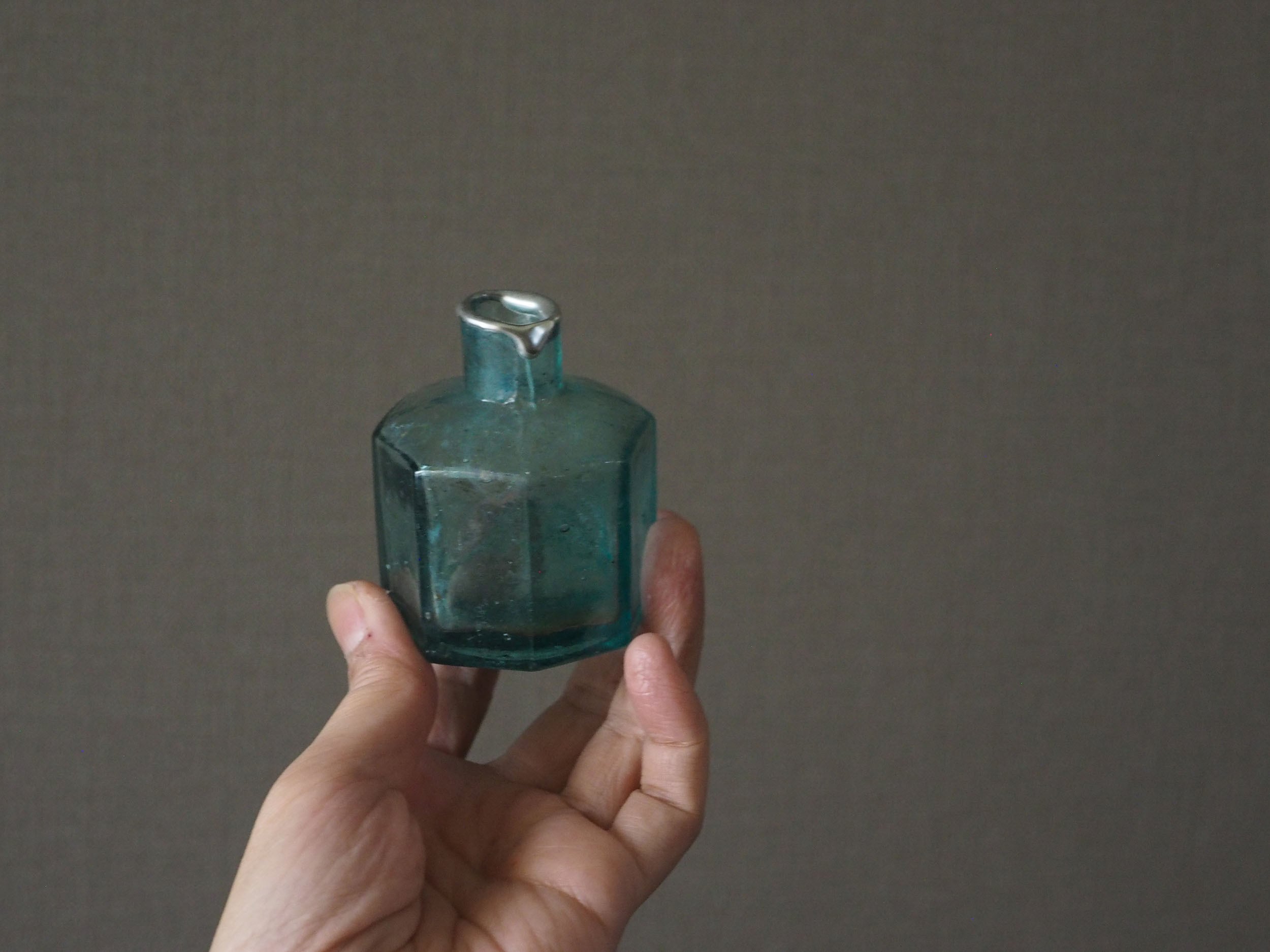 19世紀末から1920年頃にかけてイギリスで主流だった「2パーツ・モールド(二分割型)」という半手吹き・半機械的な製法で作られています。サイドの継ぎ目(シーム)、「気泡」と「ゆらぎ」、不純物によるアクアブルーが時代を象徴しています。