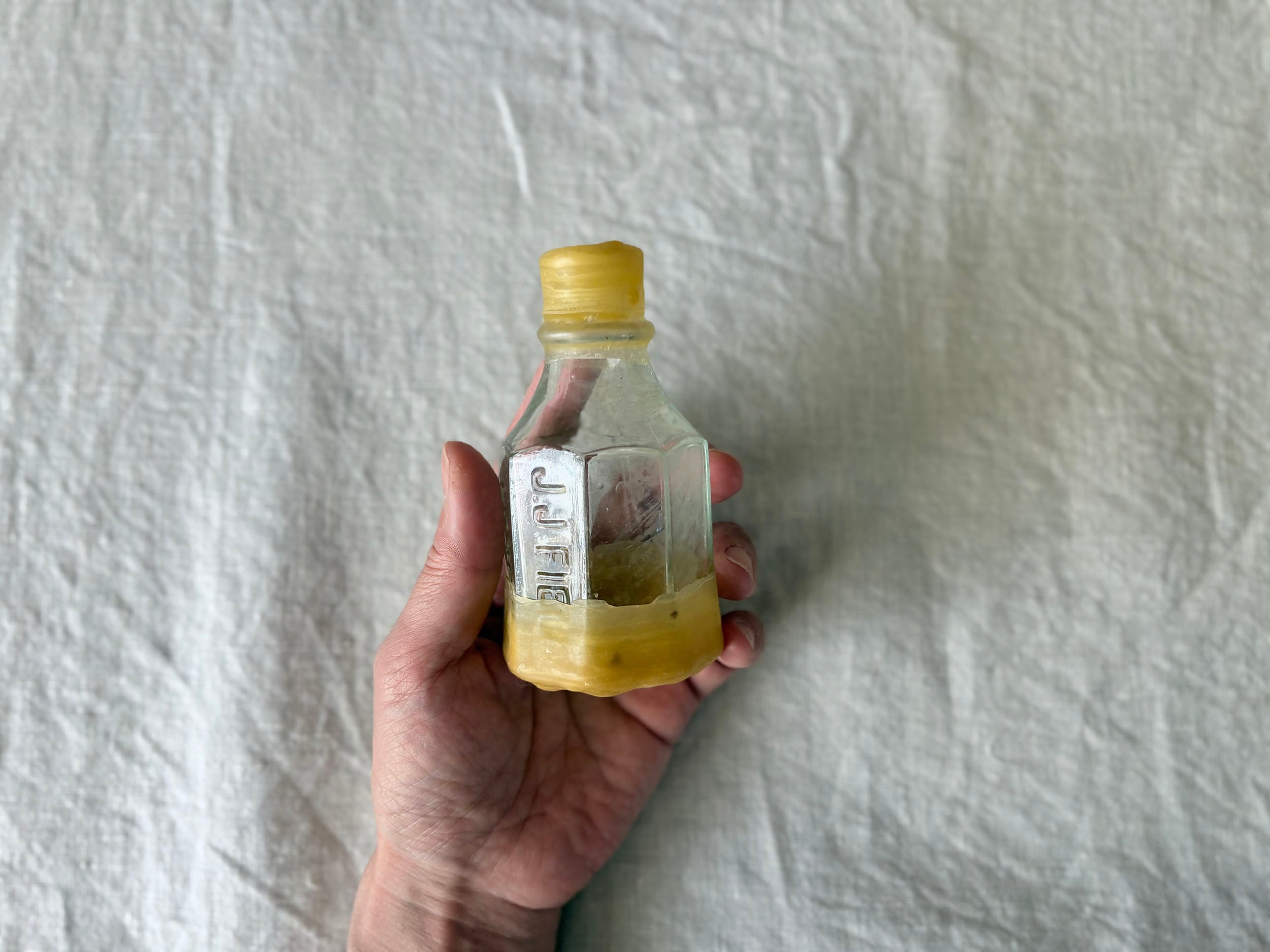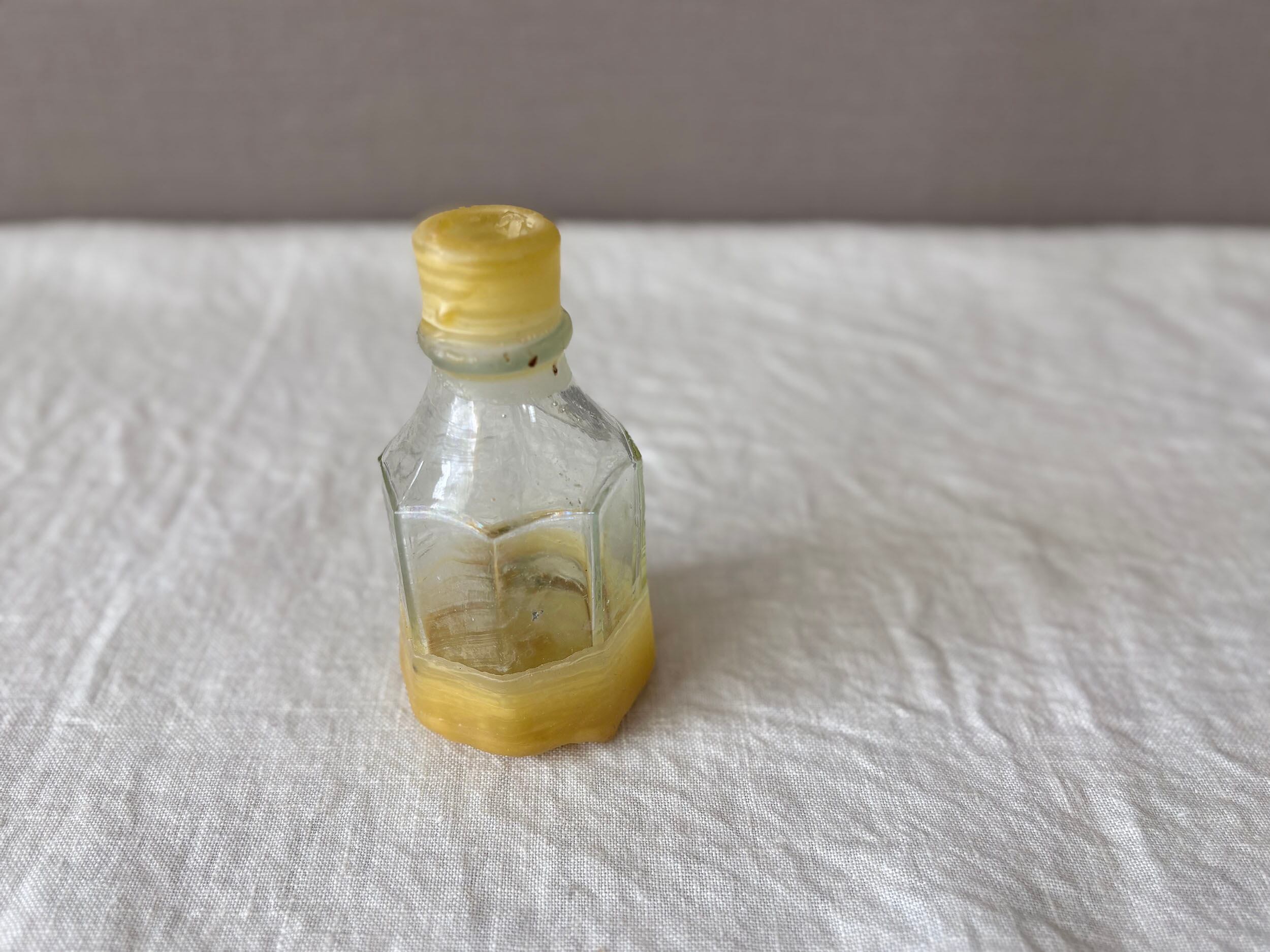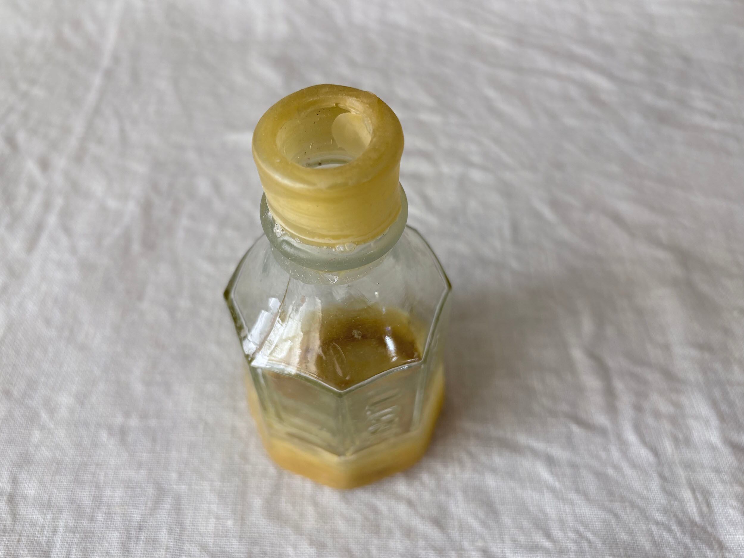 欠けたところにヤスリをかけ滑らかに、それから水拭きをして注ぎ口を蜜蝋でシーリングしました。触れるのが危なかった口元が滑らかになり新しい姿へと変容しました。19世紀イギリスのワイルドな文化の痕跡(*ガラスの特徴を参照)を、古来の素材で修復するという100年超えミッション。シールのアクセントをガラス瓶とともにお楽しみいただけると嬉しいです。