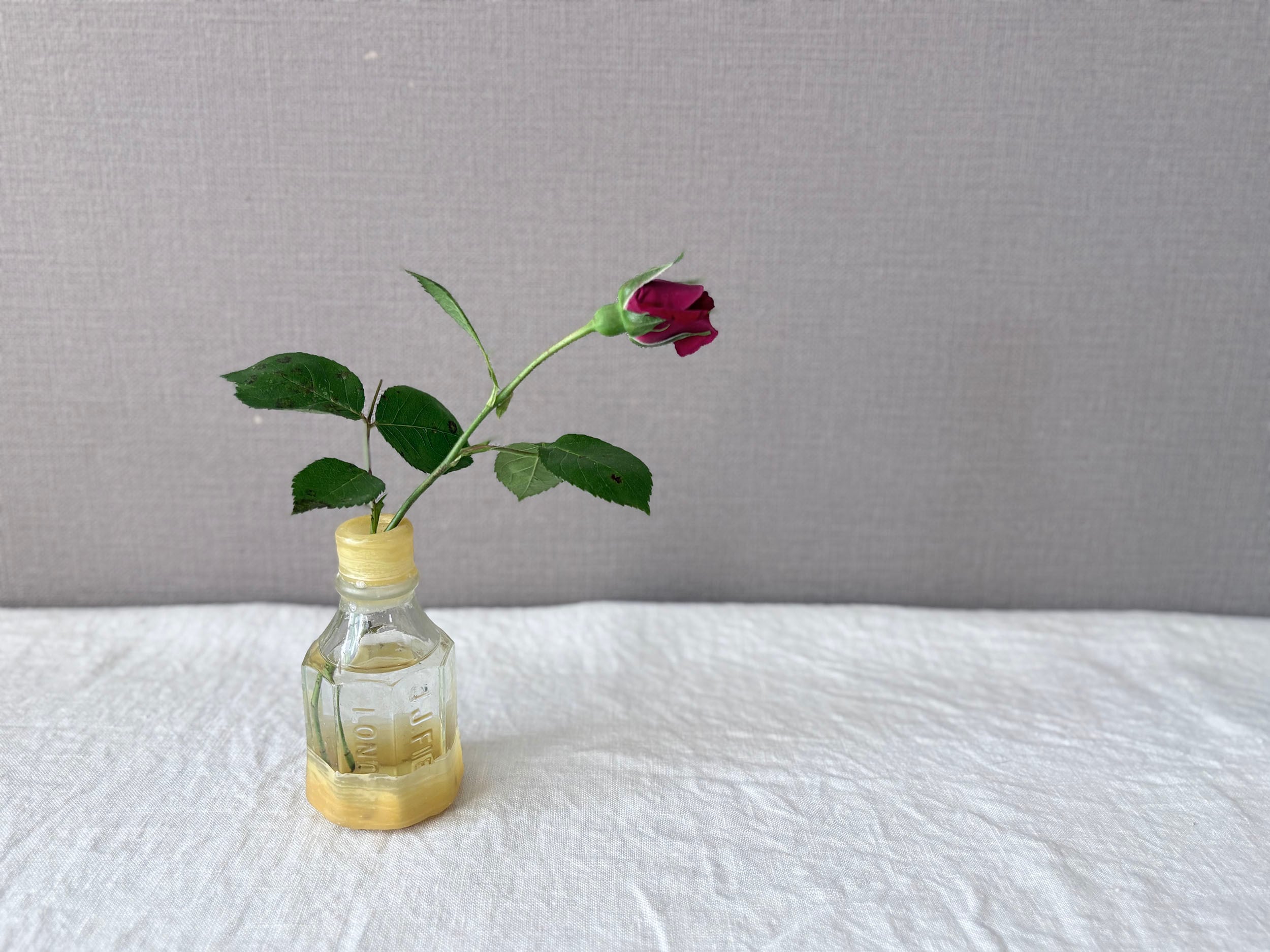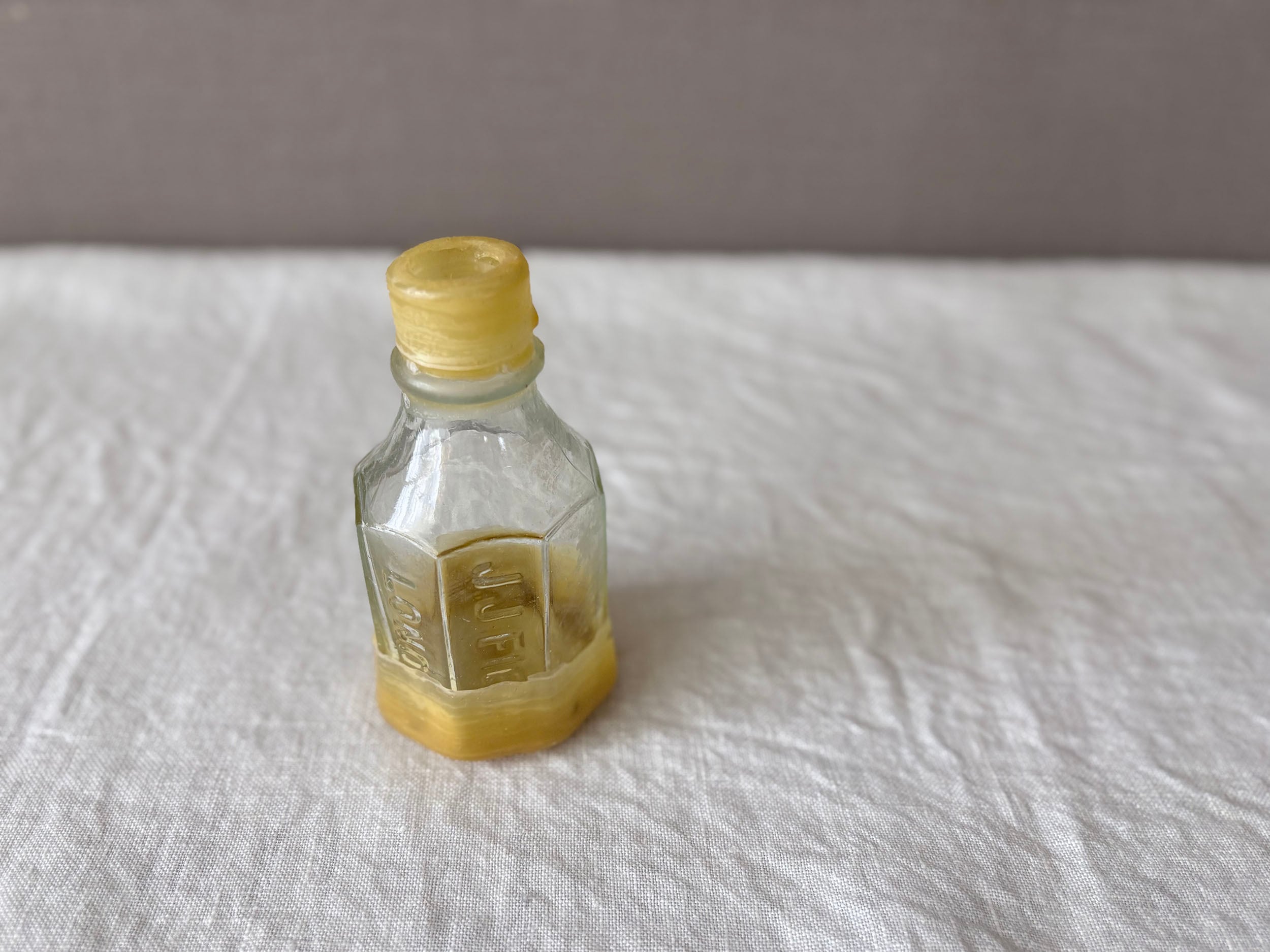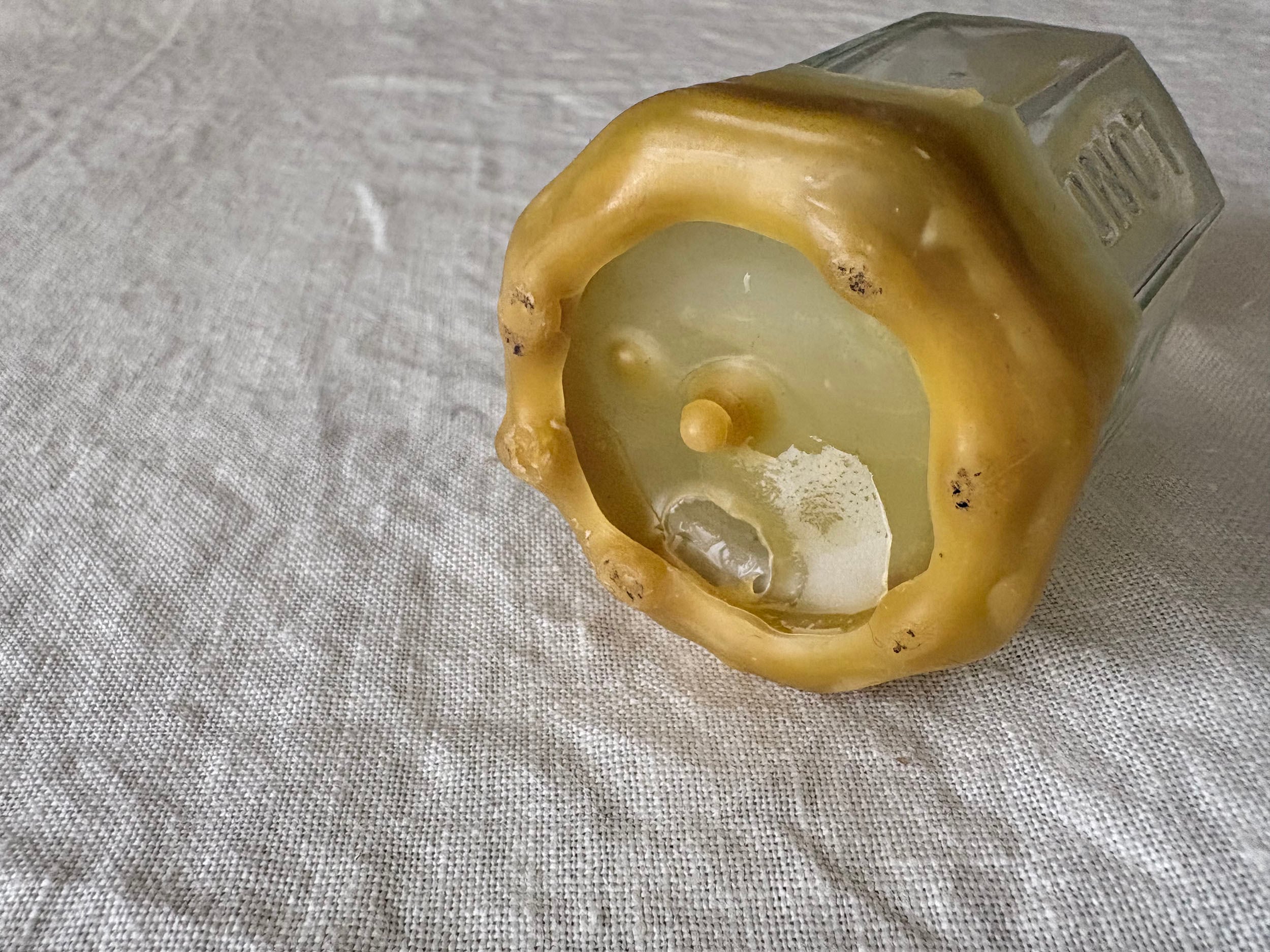 欠けたところにヤスリをかけ滑らかに、それから水拭きをして注ぎ口を蜜蝋でシーリングしました。触れるのが危なかった口元が滑らかになり新しい姿へと変容しました。19世紀イギリスのワイルドな文化の痕跡(*ガラスの特徴を参照)を、古来の素材で修復するという100年超えミッション。シールのアクセントをガラス瓶とともにお楽しみいただけると嬉しいです。